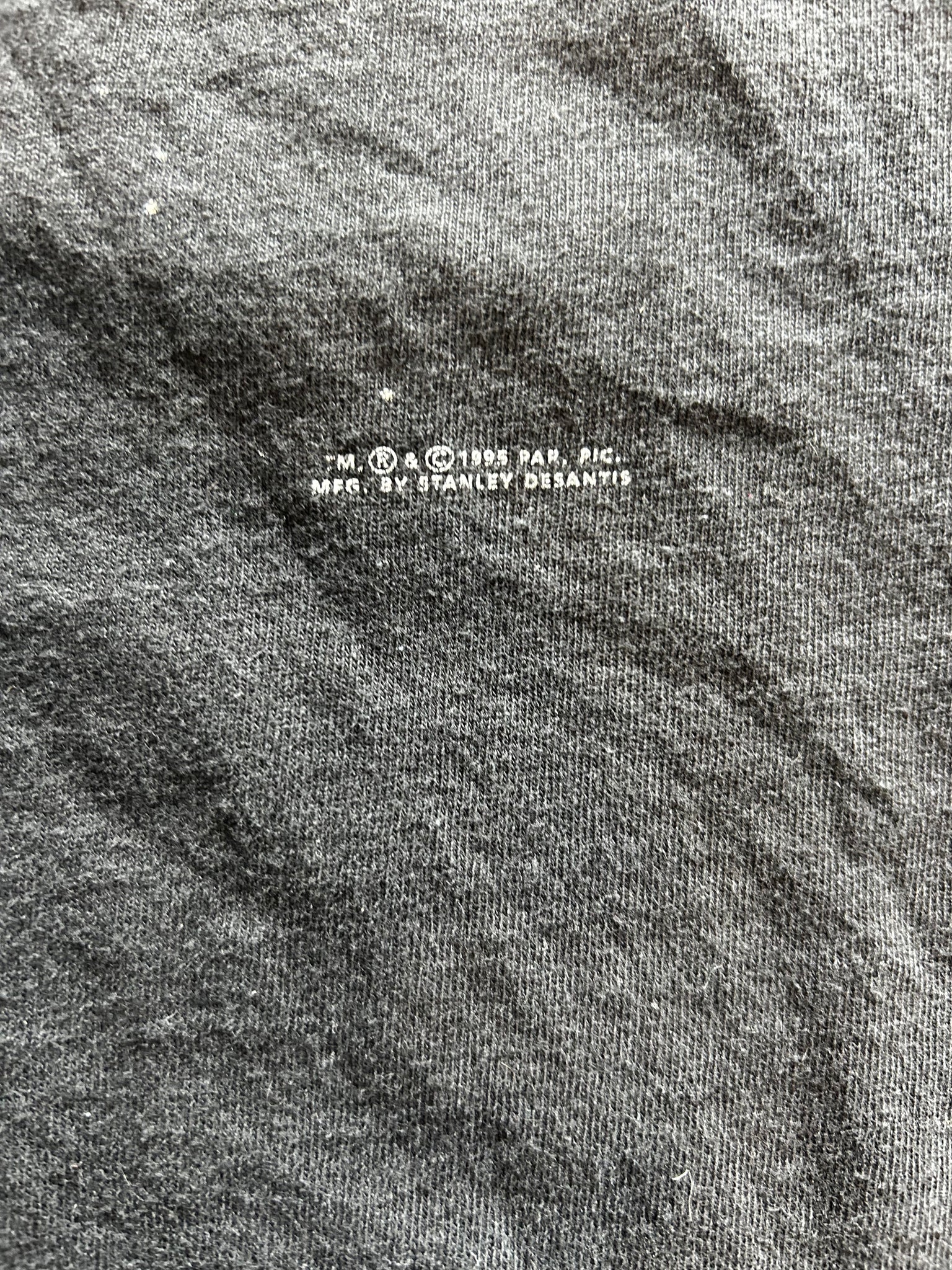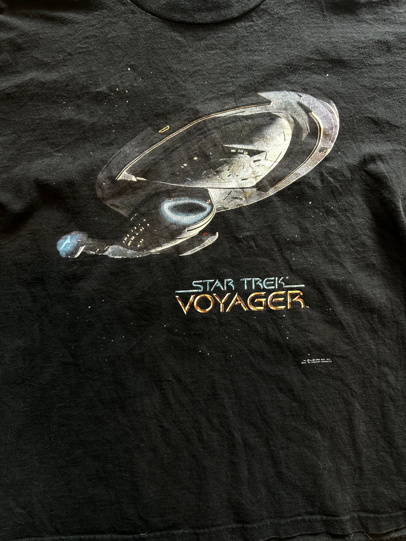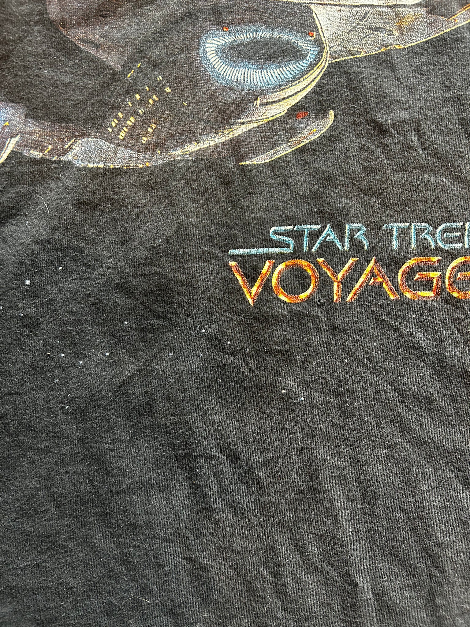 Vintage Star Trek Voyager T-shirt with a graphic of the ship on the front. Two spots of discoloration on the front and a stretched collar but otherwise good condition.
