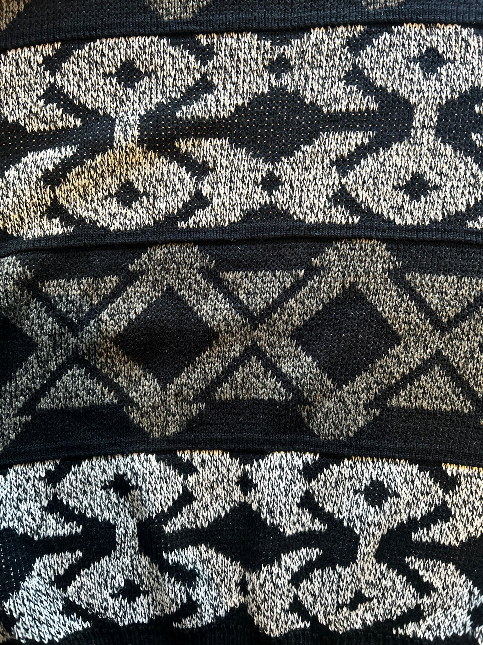 Vintage grandpa sweater with an abstract pattern on it. Pulled threads on the cuff.