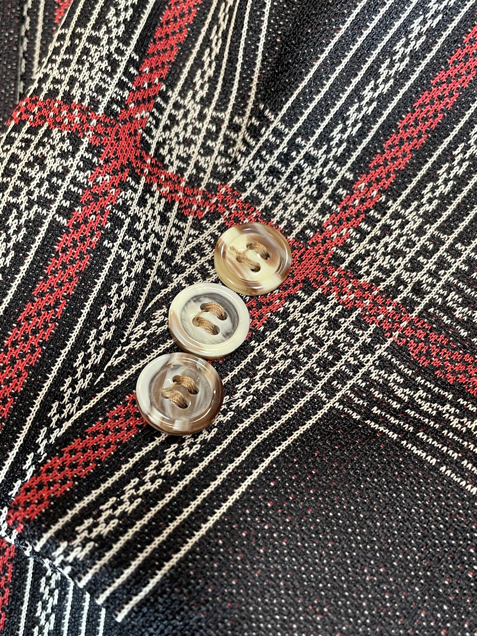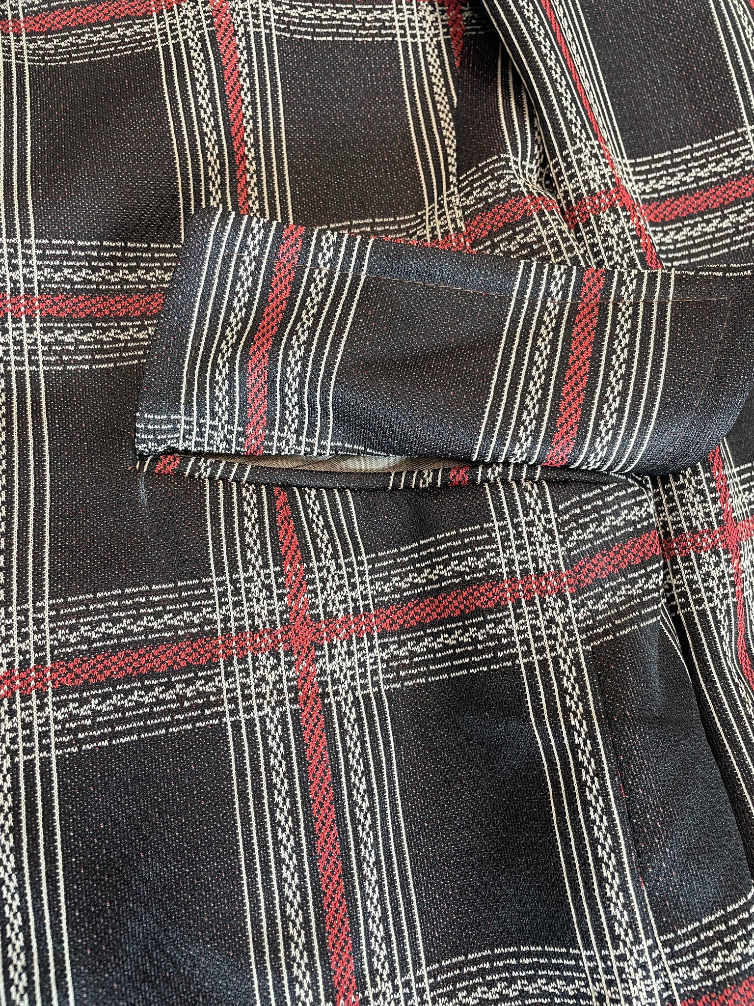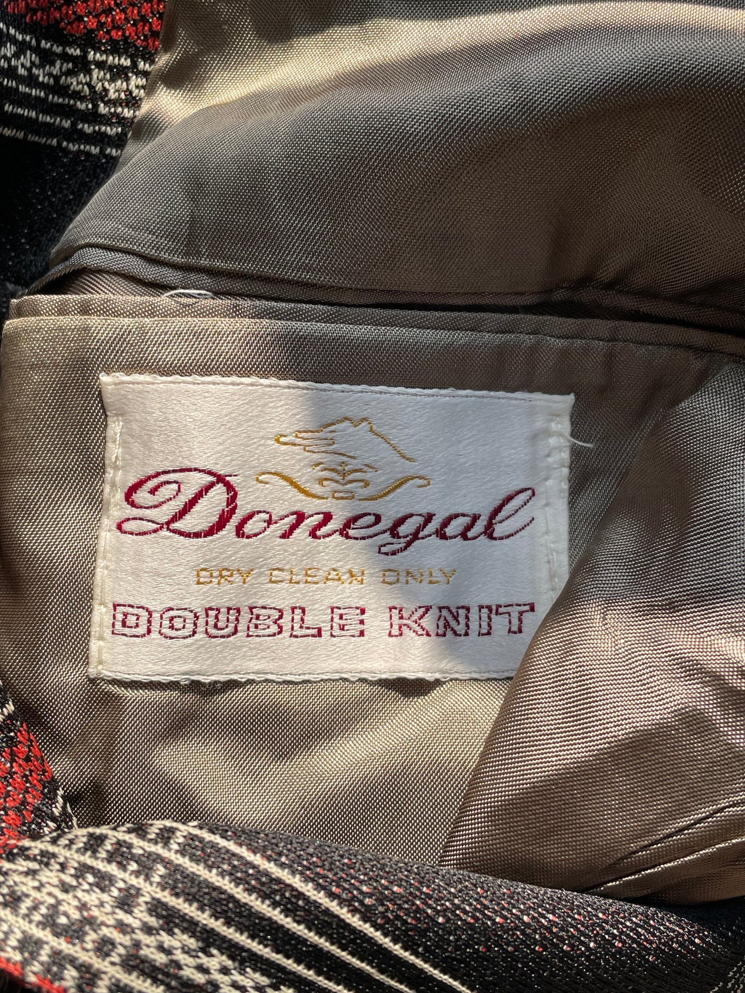 Vintage 1970s Donegal double knit blazer, with black, red, and white patterned stitching. Interior pocket tag says this blazer is a size 40 long, which typically fits L/XL. 2 button closure, covered pockets, and decorative buttons on the sleeve cuffs. In very good condition.