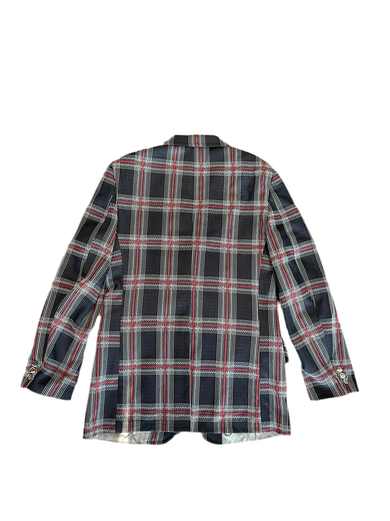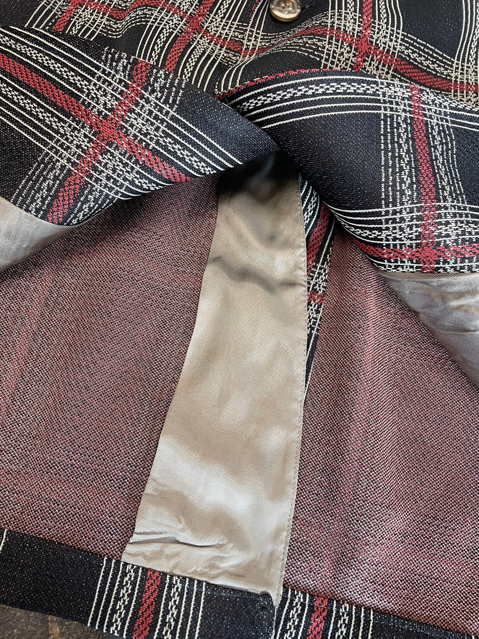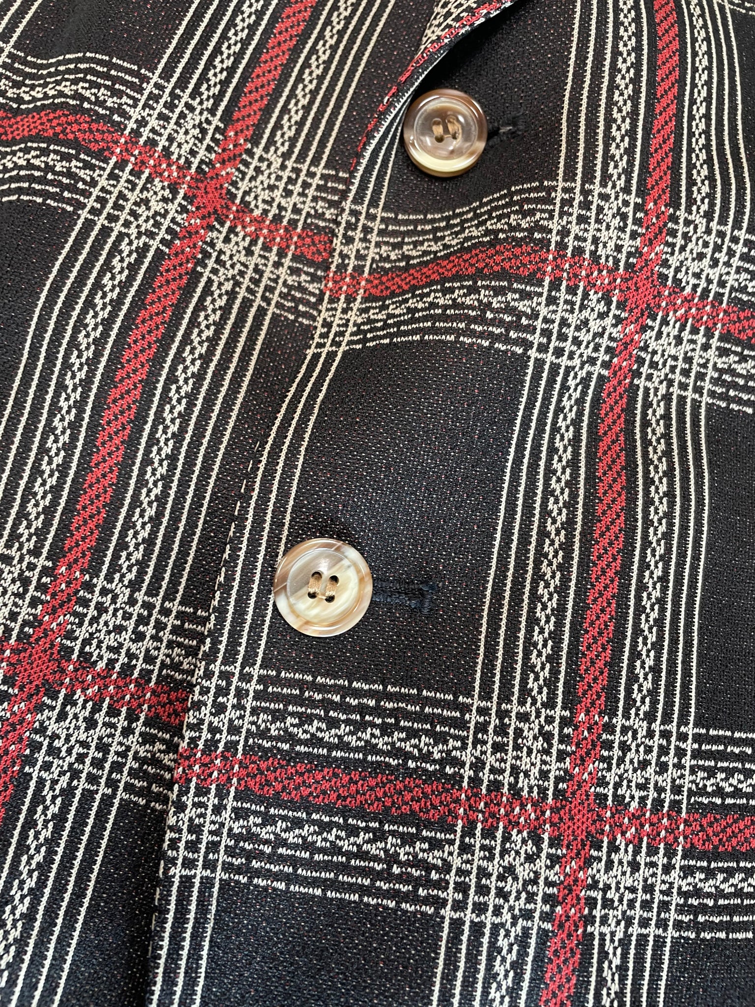 Vintage 1970s Donegal double knit blazer, with black, red, and white patterned stitching. Interior pocket tag says this blazer is a size 40 long, which typically fits L/XL. 2 button closure, covered pockets, and decorative buttons on the sleeve cuffs. In very good condition.