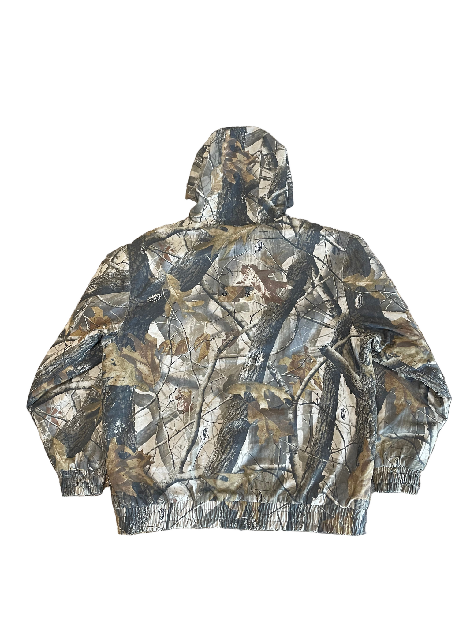 Outfitters Ridge Realtree printed Camo zip-up jacket. Size L, made in Bangladesh, has lining and insulation as well as exterior and interior pockets. Drawstring hood. Very good condition, no flaws found.