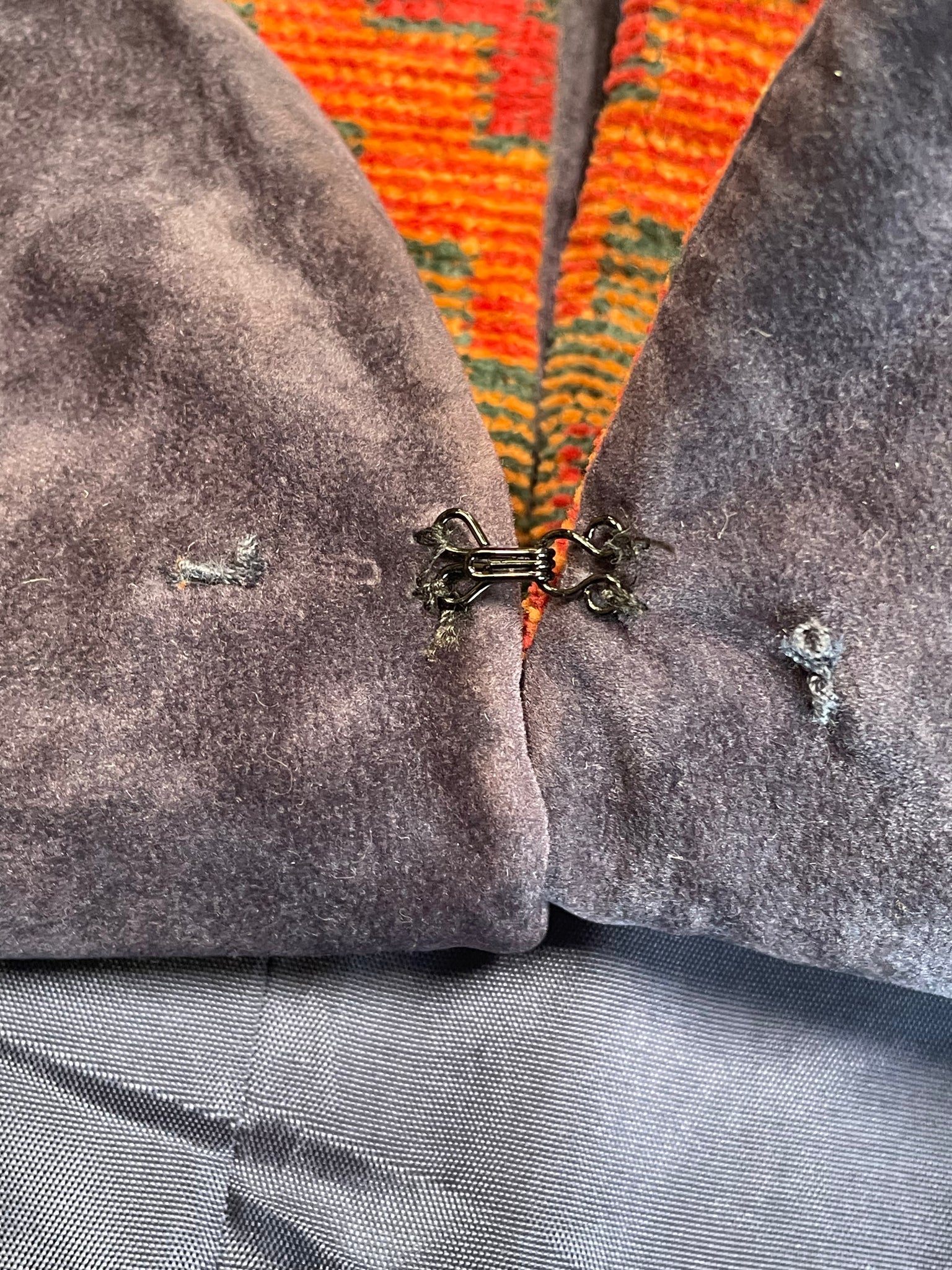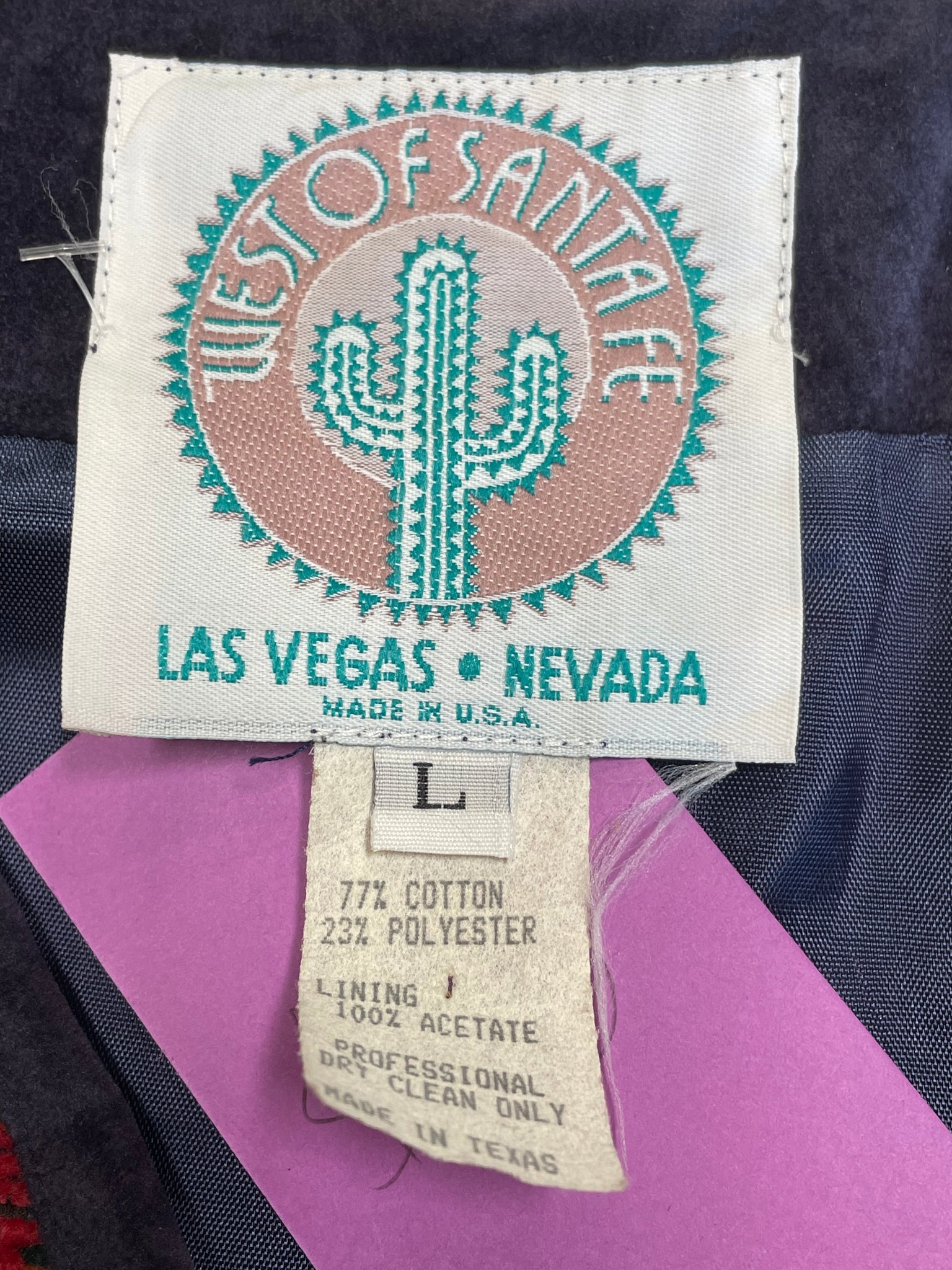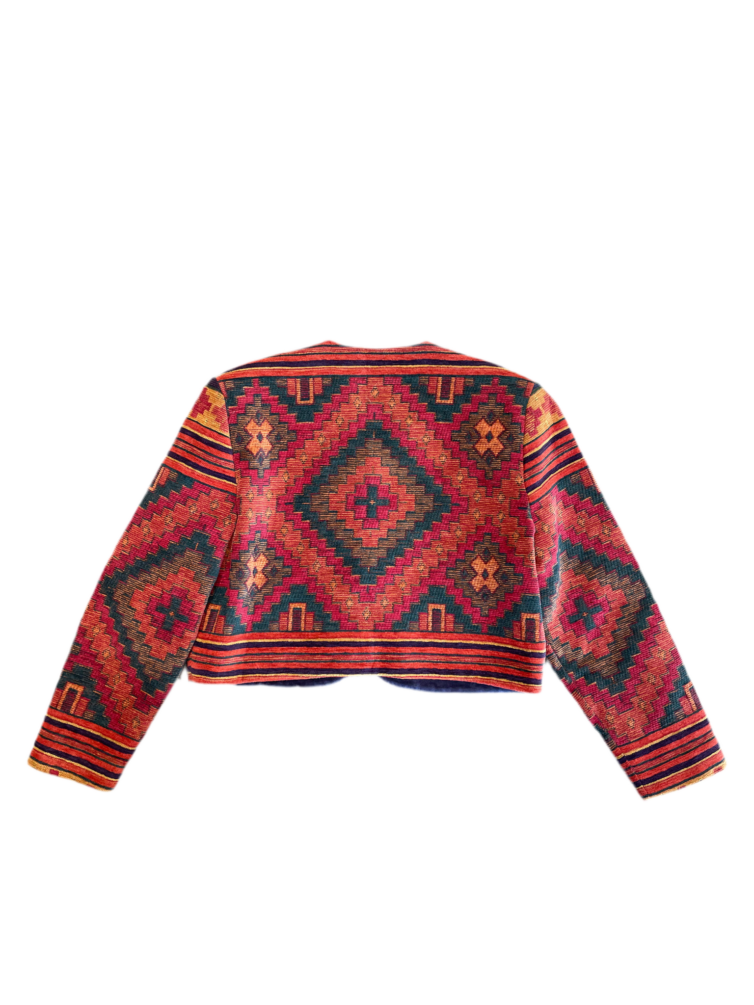 Vintage Navajo-inspired tapestry bolero jacket with stamped silver buttons. The interior of the jacket has a pair of hook & eyes to keep it closed towards the bottom. Fabric is very brightly colored and velvet-y feeling, in fantastic condition. Tag says "West of Santa Fe, Las Vegas - Nevada", size Large, Made in the USA (Texas). Cropped and boxy fit.