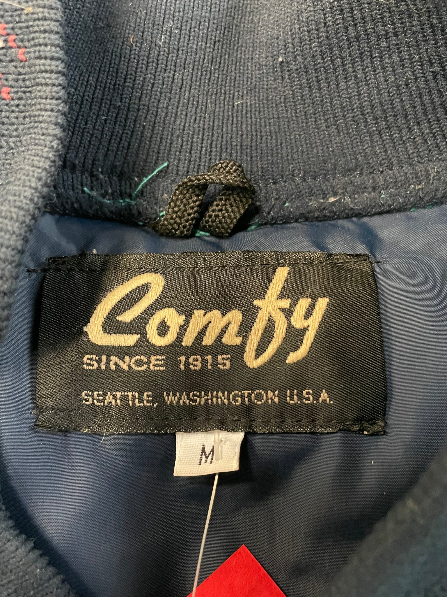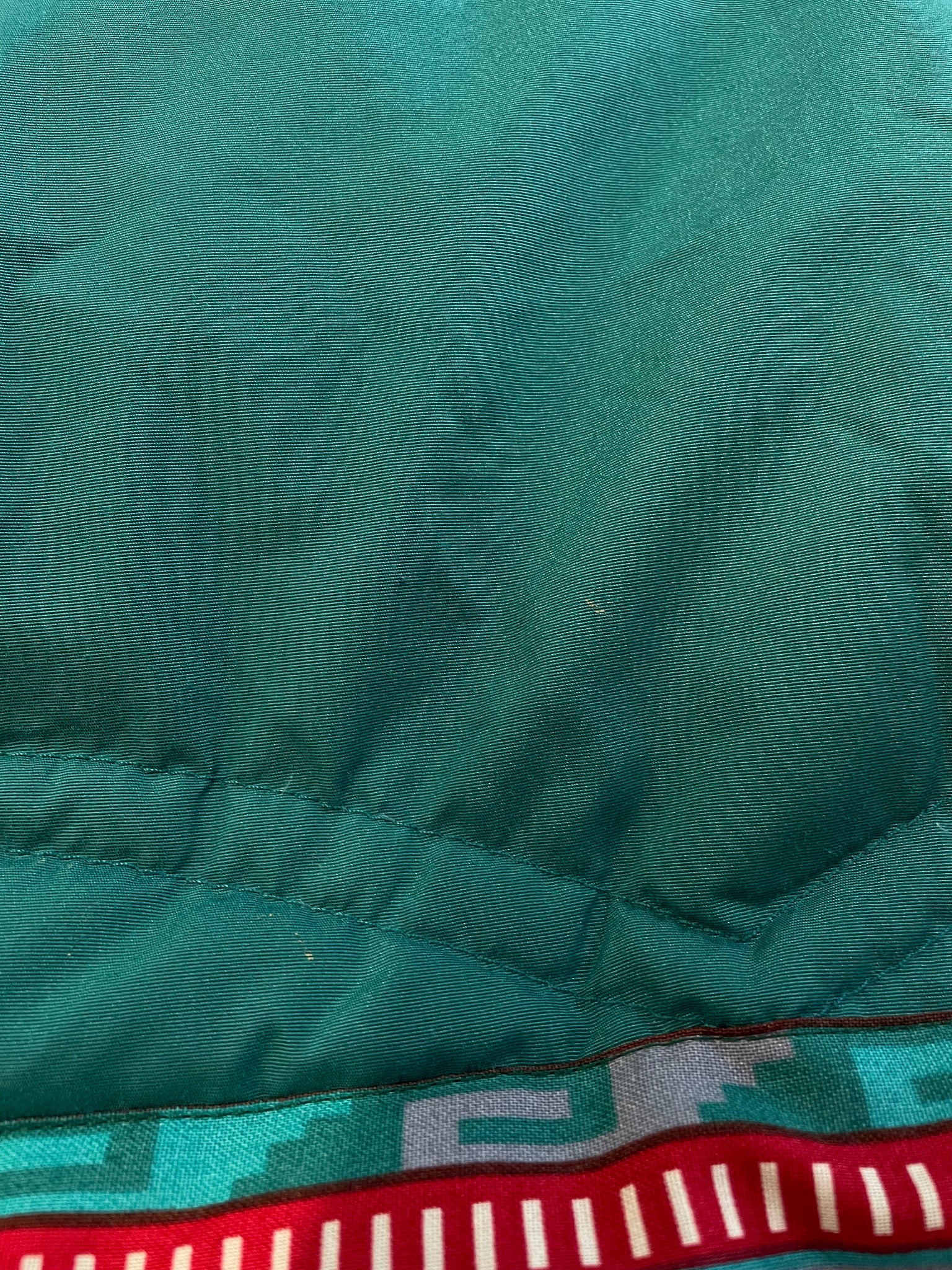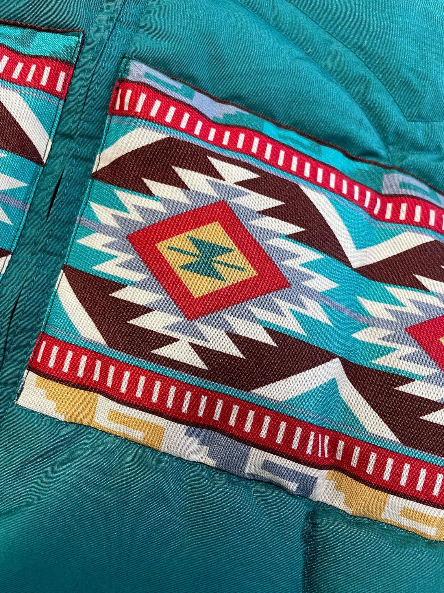 Vintage "Comfy" Seattle Washington brand turquoise Aztec print puffer jacket. In fantastic condition, the only flaw is one of the interior tags is starting to disintegrate a bit. Size Medium, Made in the USA. Color is more of a green turquoise in person, most accurate to the 8th picture shown above.