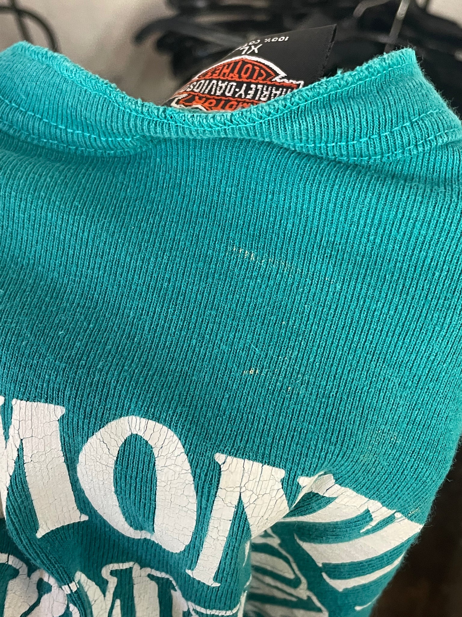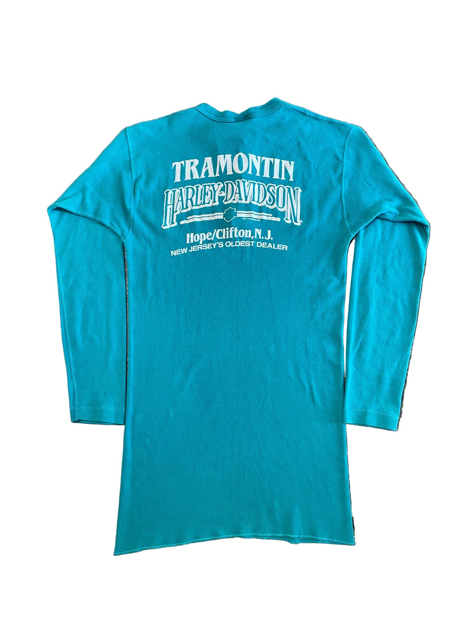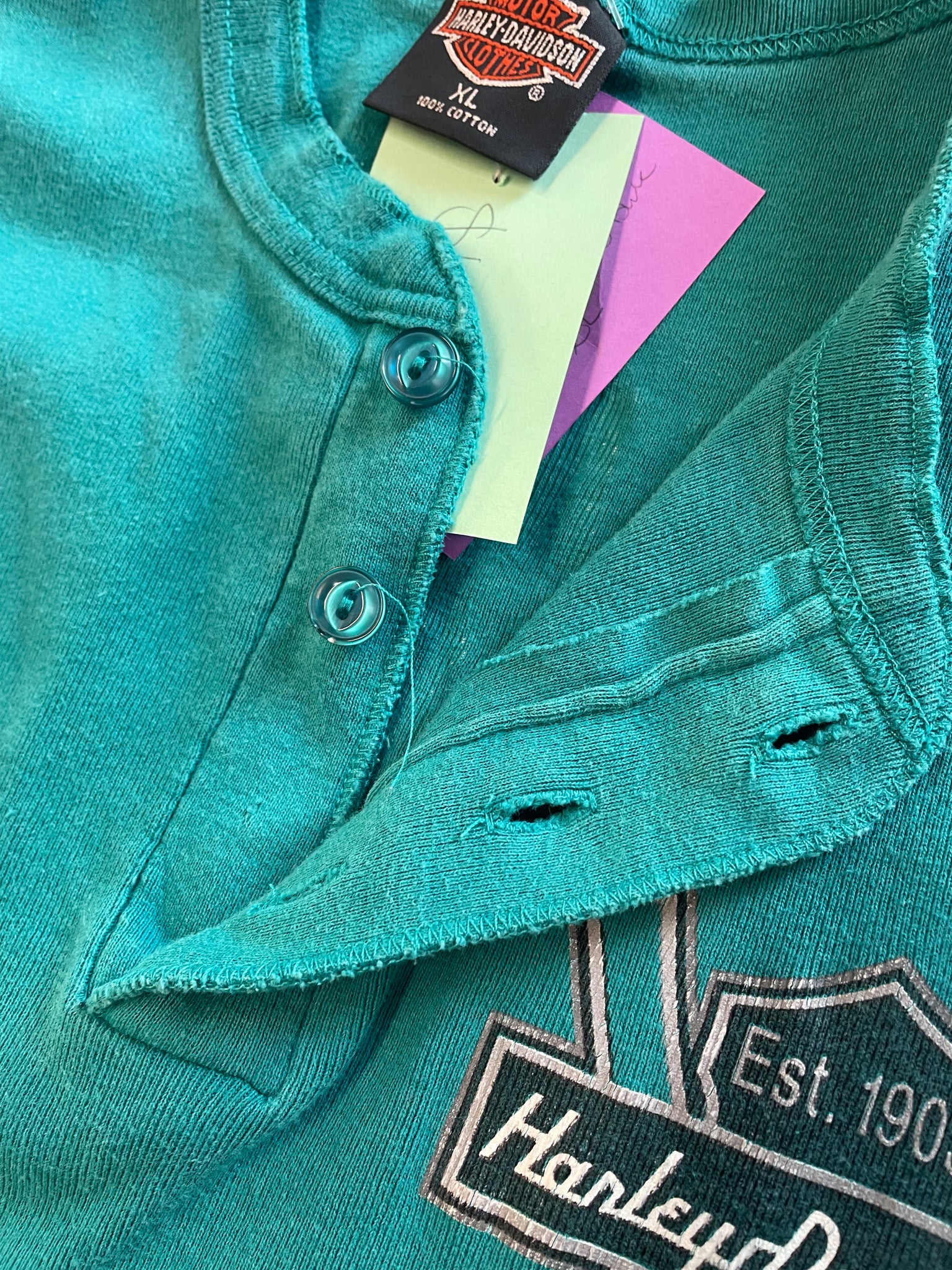 Vintage 1990s Harley Davidson of Hope/Clifton, NJ Longsleeve teal Henley. Fits very long and slim, and is very stretchy. Small chest print and back print of logos and locations. Tag says size XL but fits smaller (more like a M-L), made in the USA. Imperfections are a missing bottom button, and some stains on the front and back from age and wear, all pictured. Some distressing and stretching to the collar as well. Otherwise good condition.