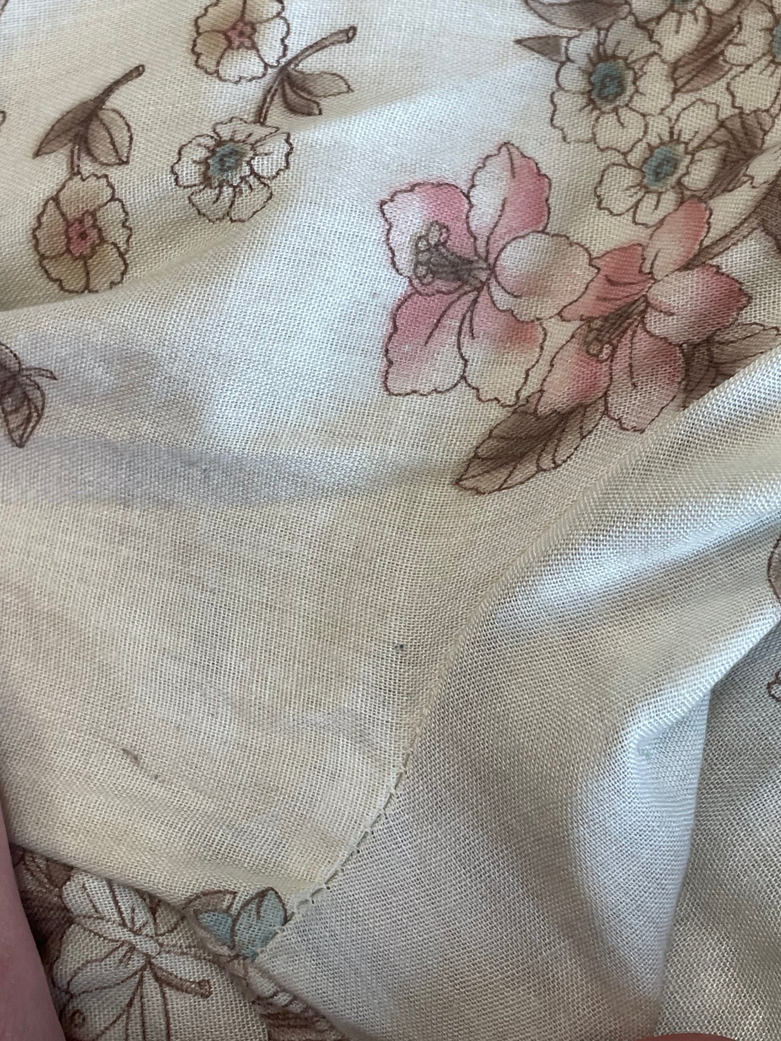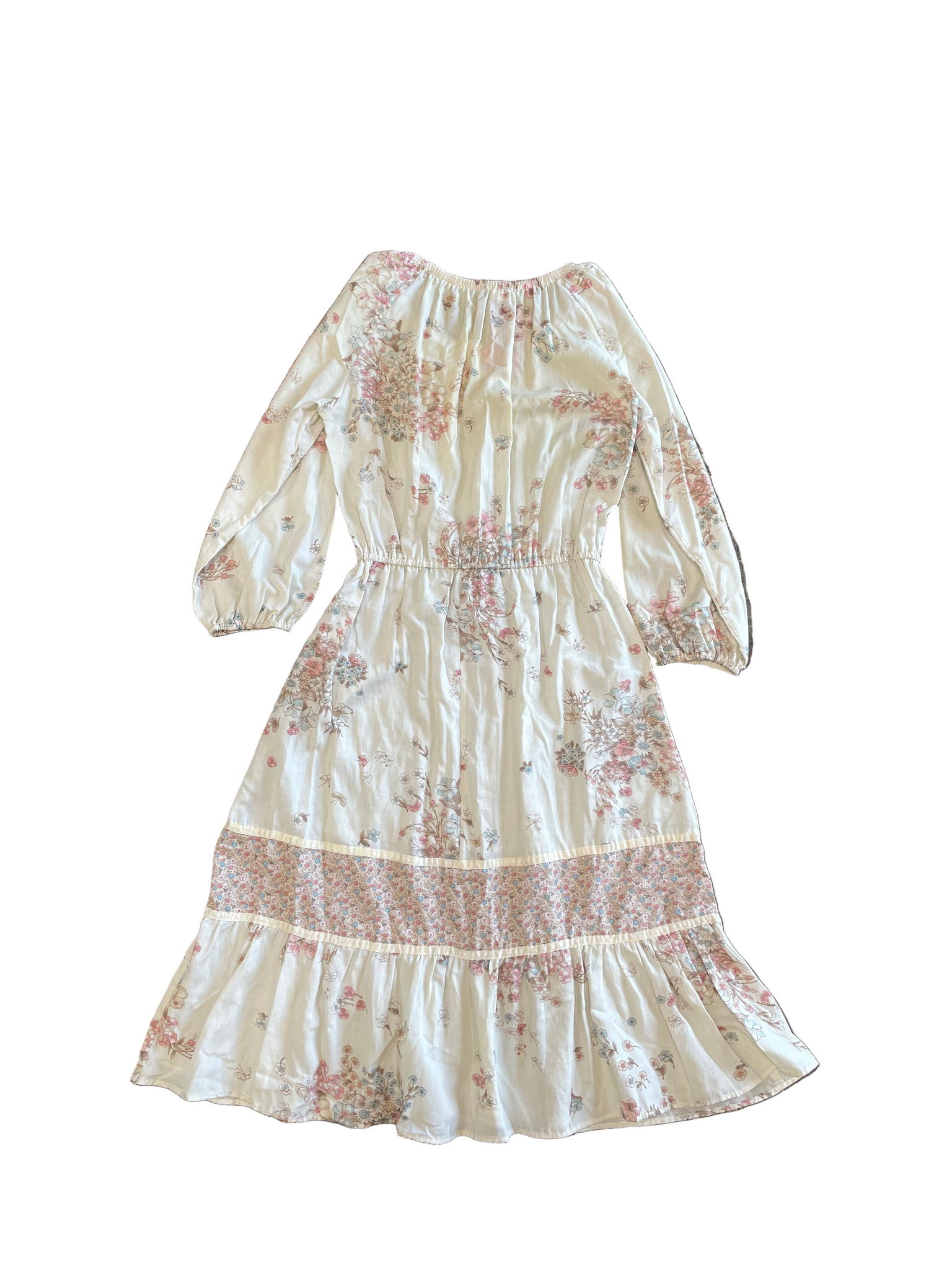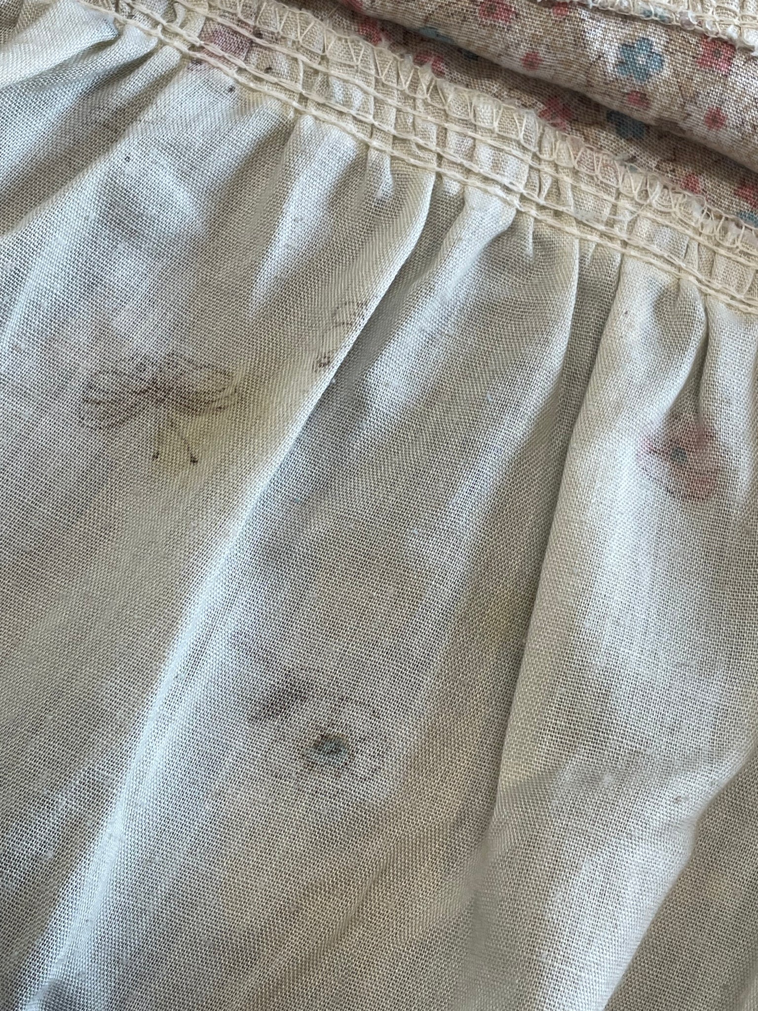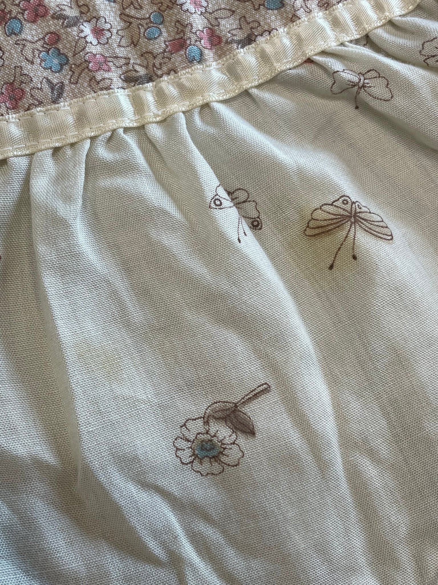 Vintage 1970s women's prairie dress with pastel flowers and butterflies printed all over. Estimated to be an S-M, the elastic in the waist and collar/cuffs are still very stretchy. Made in the USA. Somewhat stained faintly in small areas on the skirt, but there is a large stain on one arm that is more noticeable. Pits are very slightly stained, and the back is sun faded and discolored from wear, pictured. Otherwise good condition.