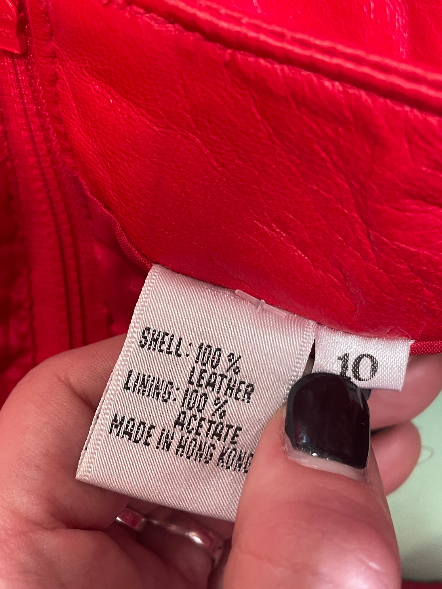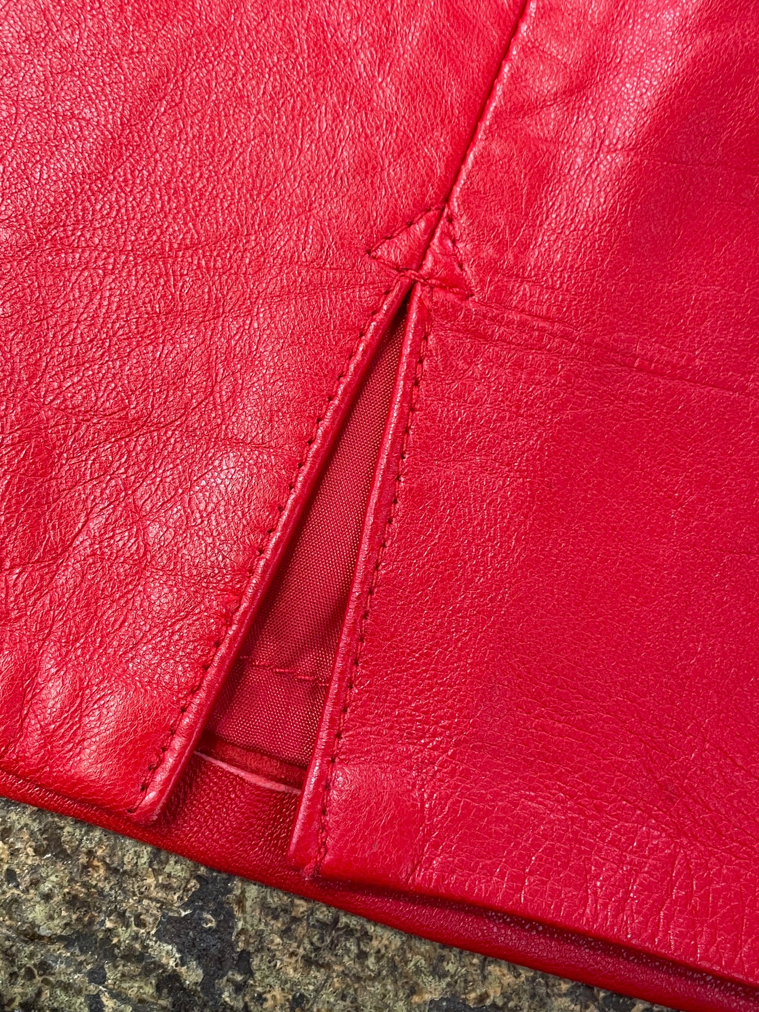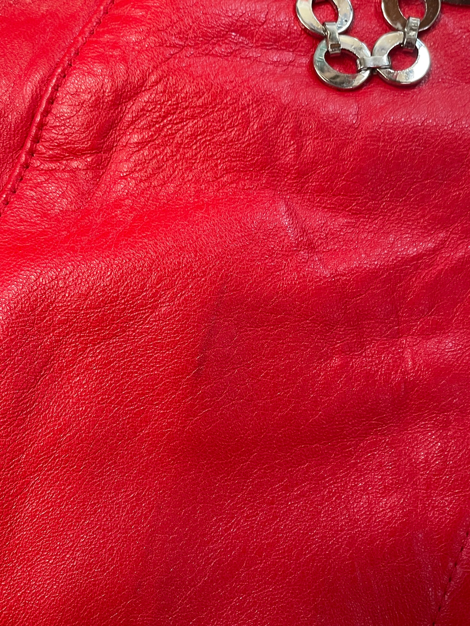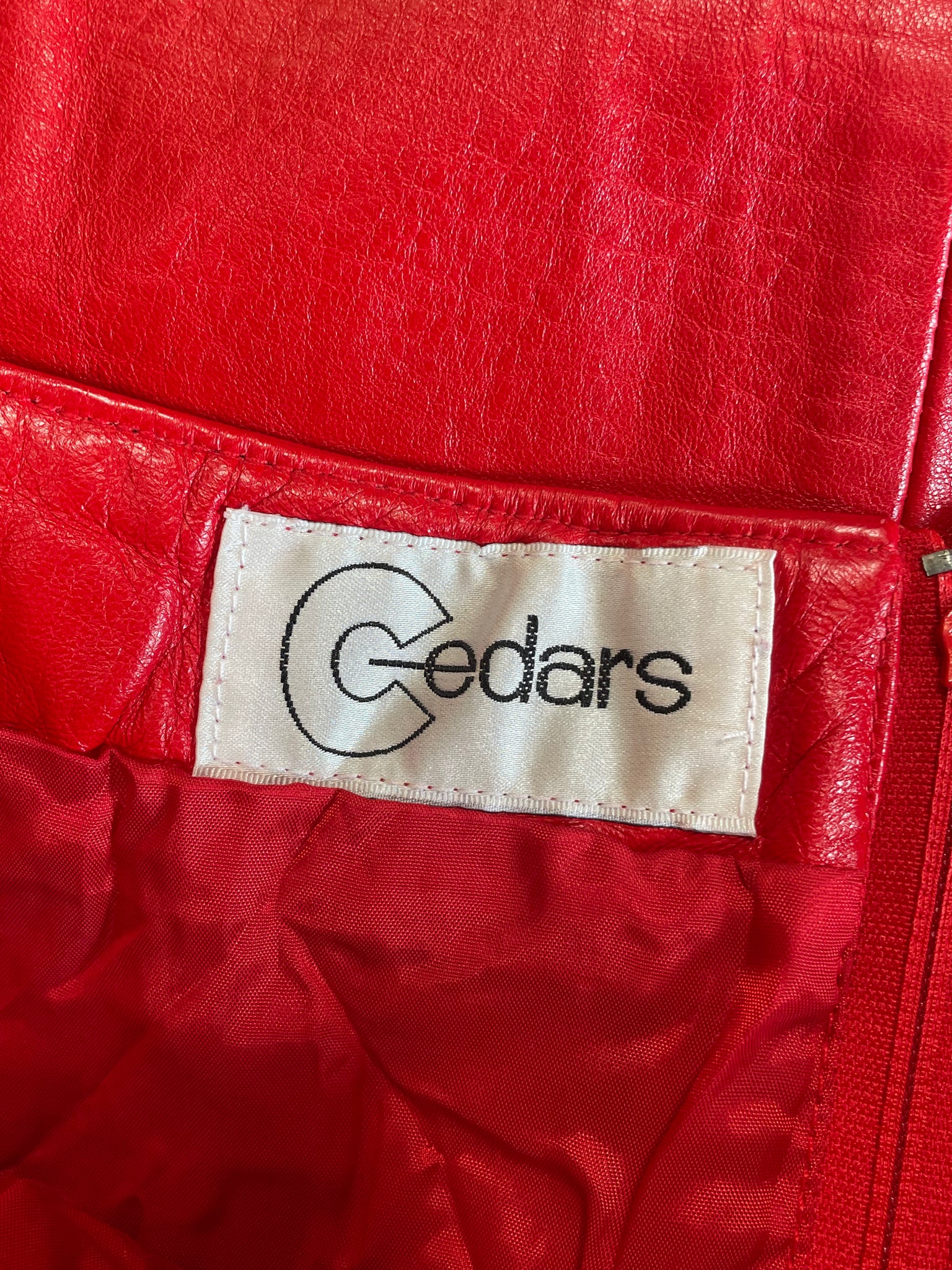 Vintage Cedars red leather skirt with grommet and chain details. Size 10/Medium, made in Hong Kong. Overall good condition, only a couple of small marks on the leather, all pictured. Zip closure in the back.