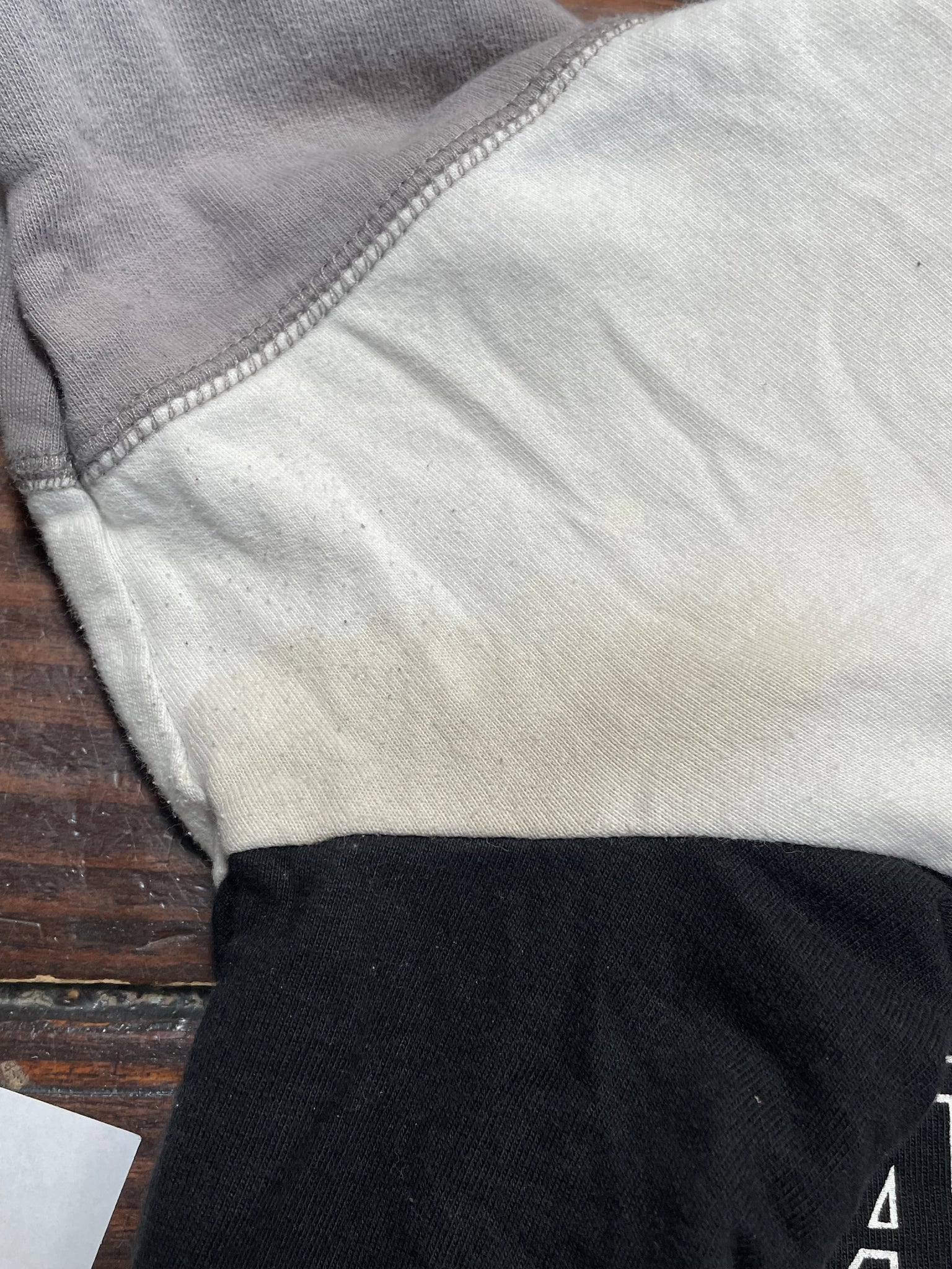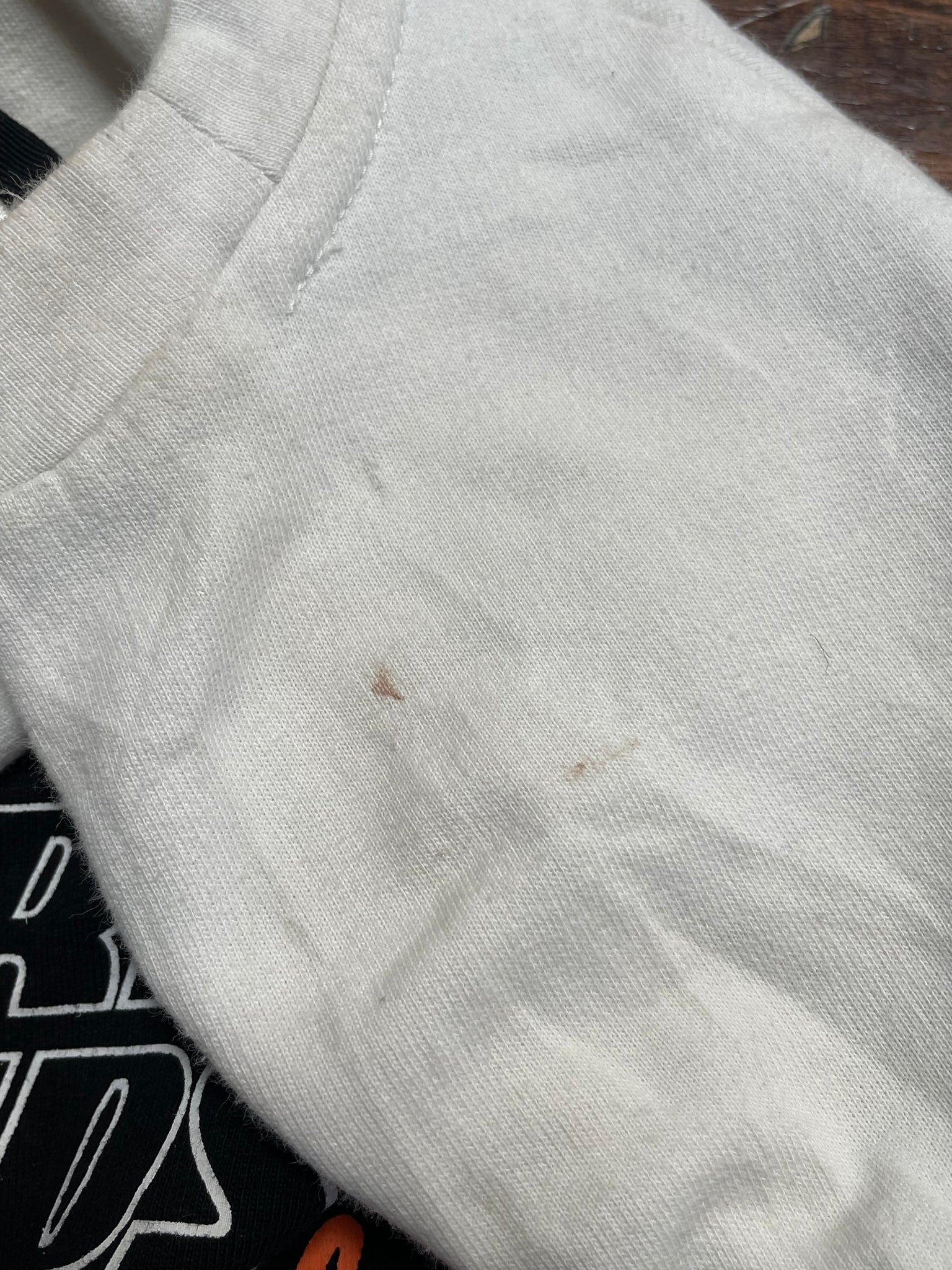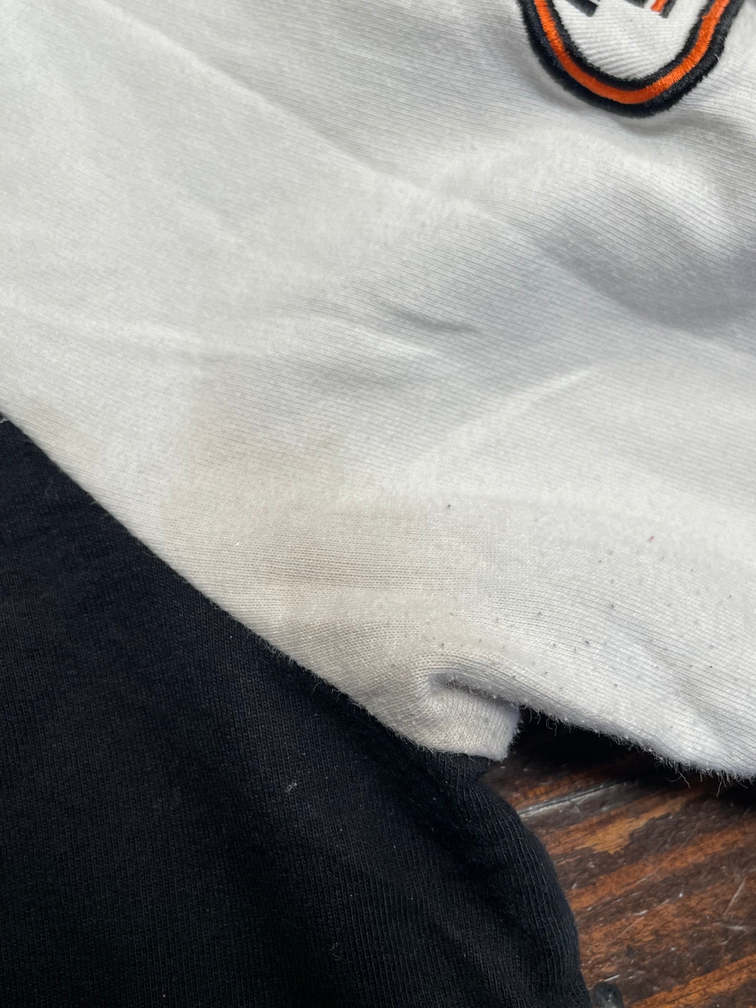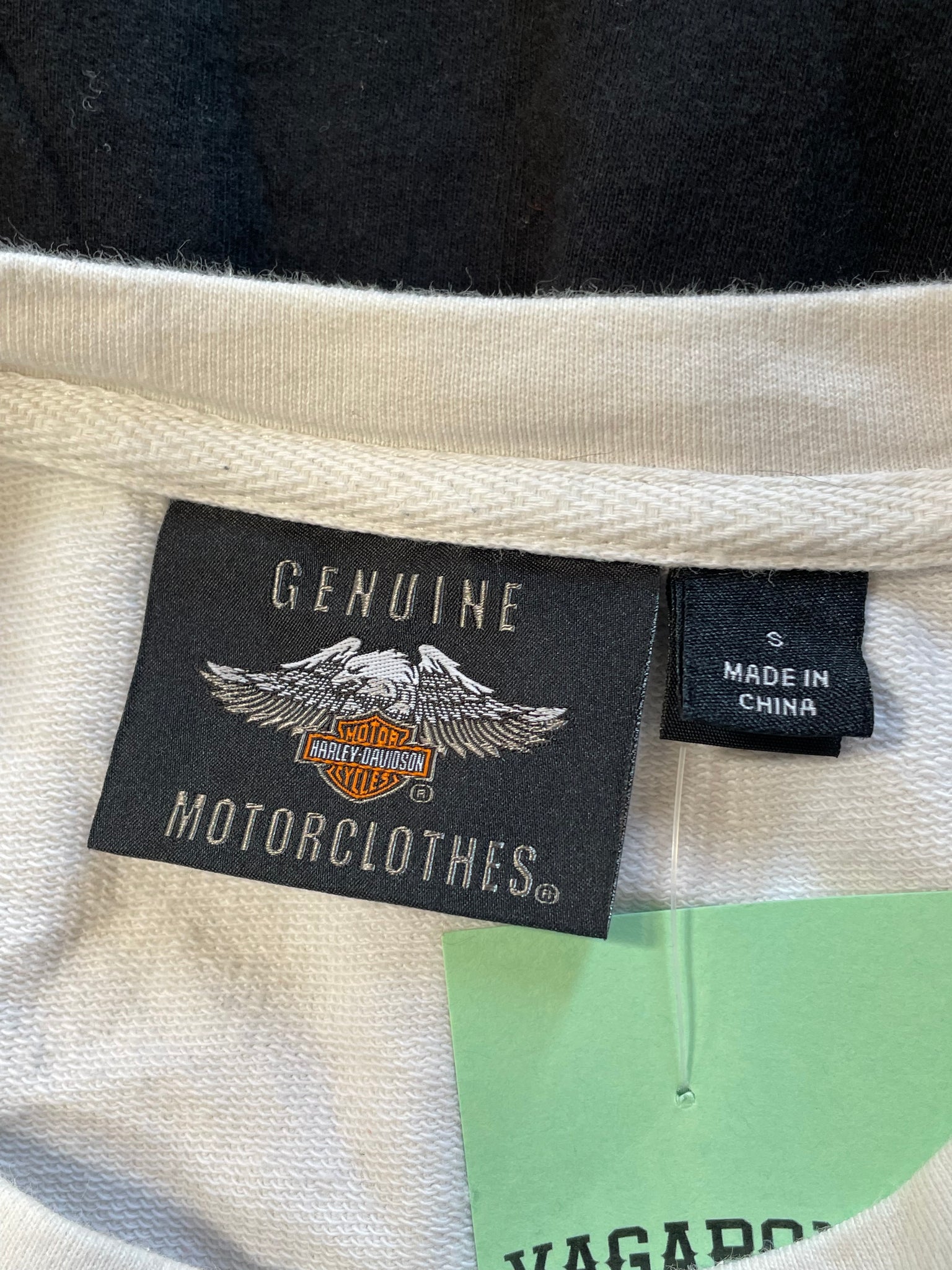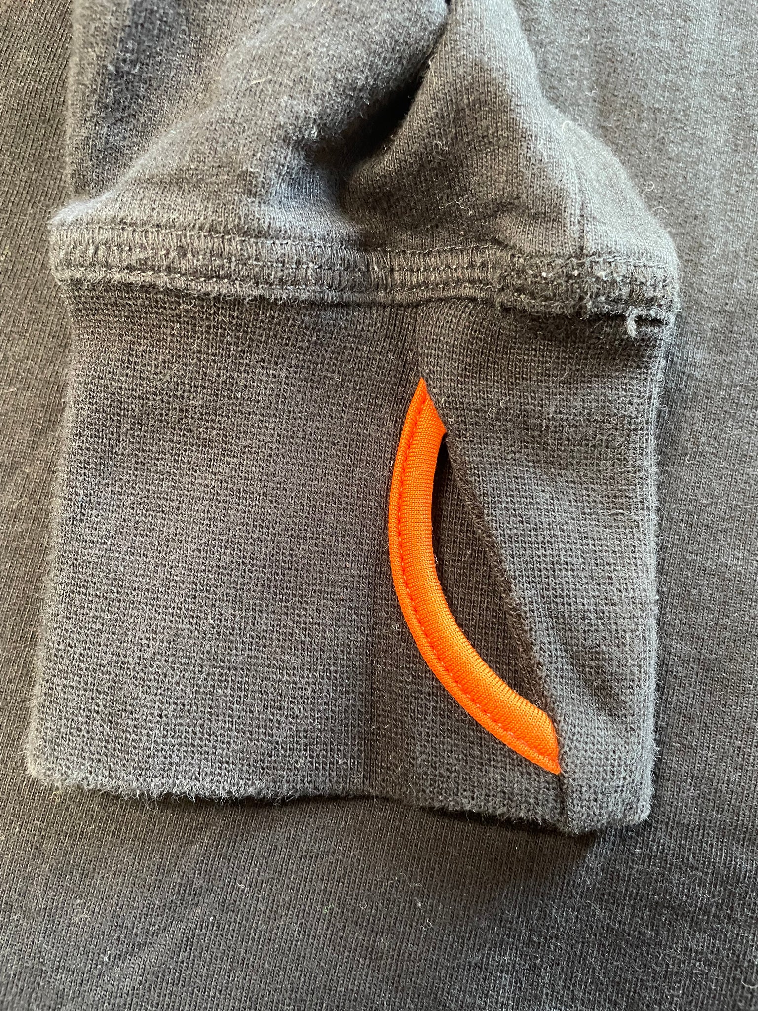 Harley Davidson longsleeve riding t-shirt, very heavyweight material, like a thinner version of a sweatshirt. Tri-color construction with orange details, and a patch on each shoulder. Lots of small stains on the arms and back, and the pits are a little stained. Size S.
