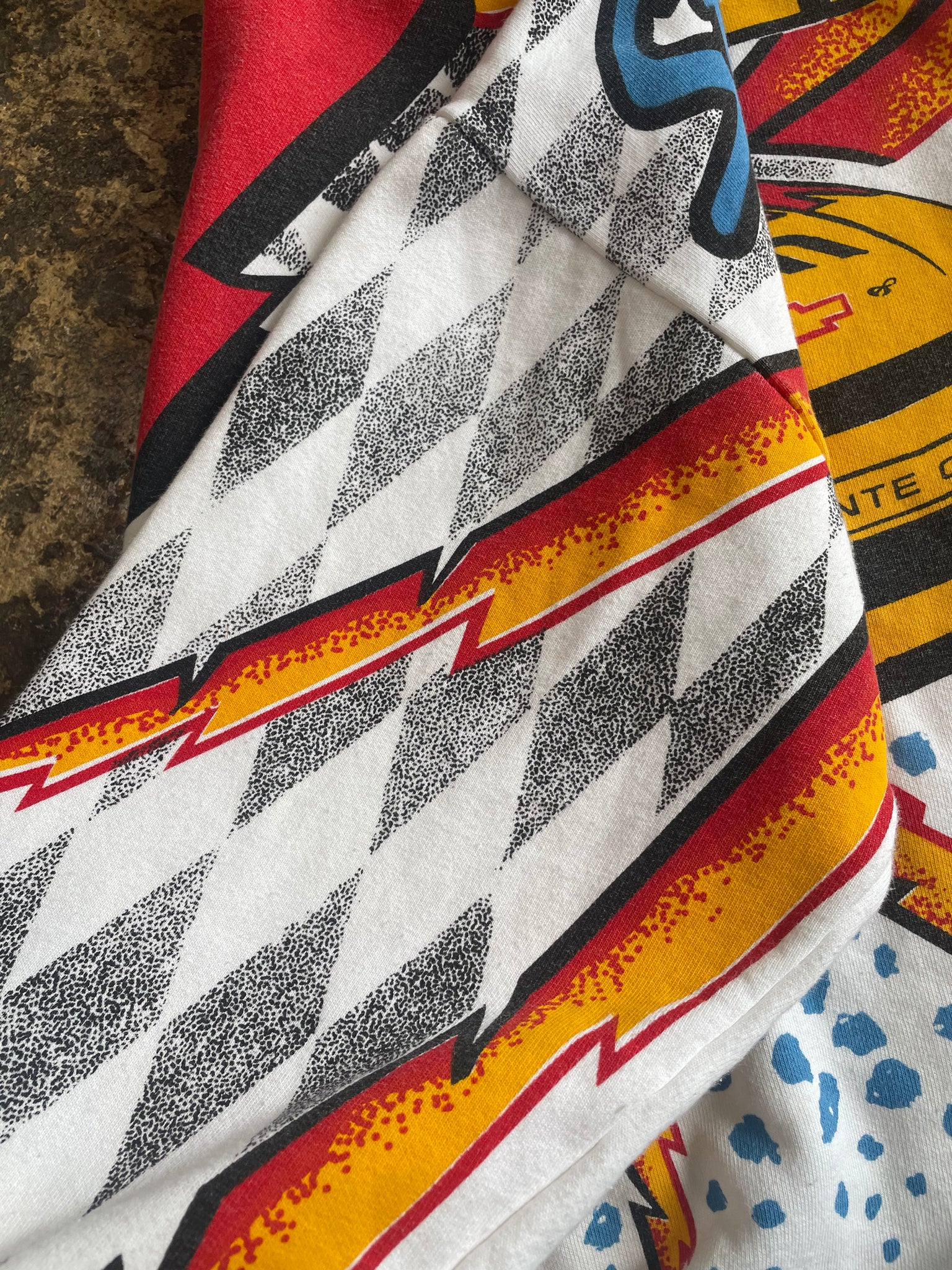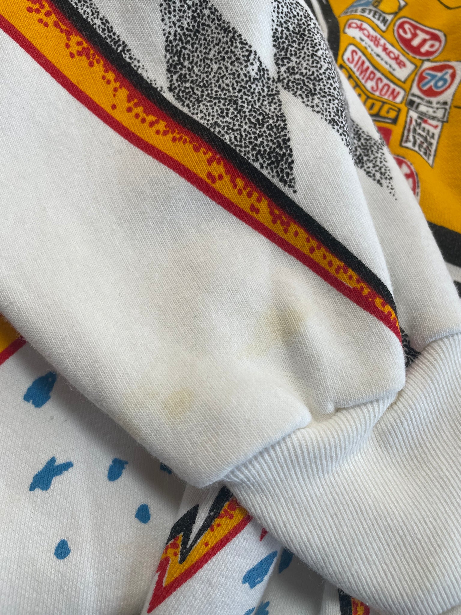 Vintage 1990s NASCAR Sterling Marlin sweatshirt with all-over print of lightning, racing checks, Marlin's name, and his classic Monte Carlo. Size M, Made in the USA. Almost perfect vintage condition, one small stain found on one sleeve by the cuff, pictured.