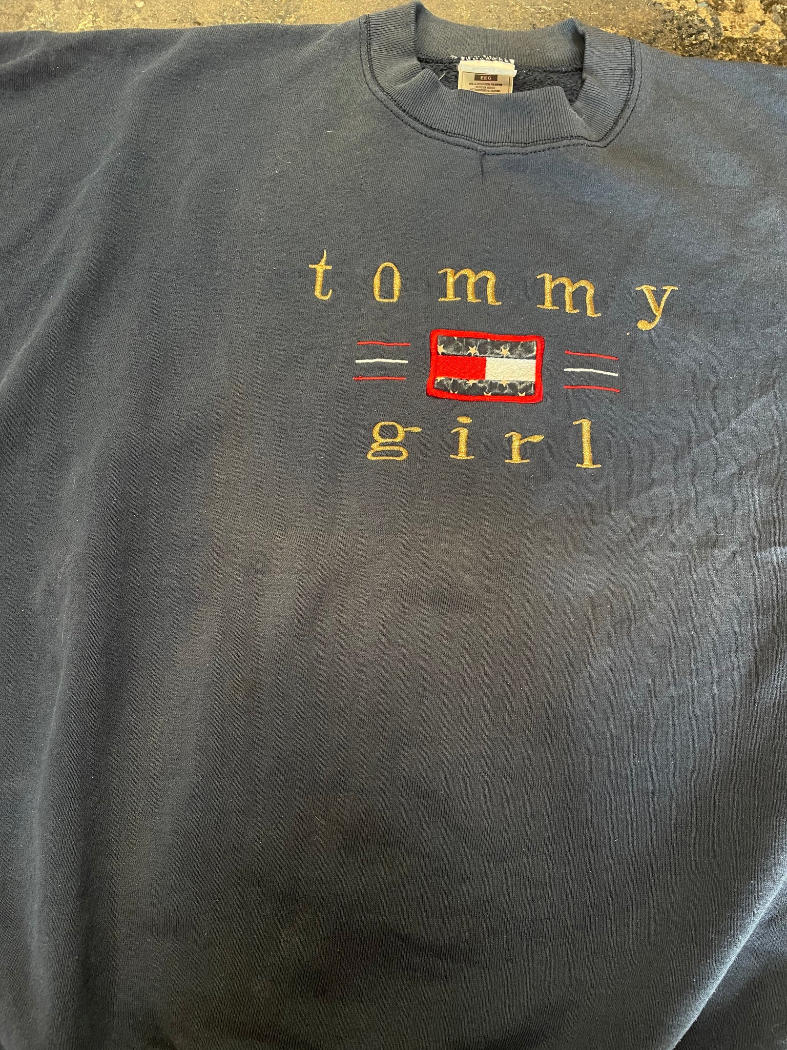 Vintage Tommy Girl faded crewneck sweatshirt with embroidered logo. Lots of fading, and a couple of holes on the elbows of the sleeves. Some slight staining on sleeves, pictured. Size XXL, made in Mexico.