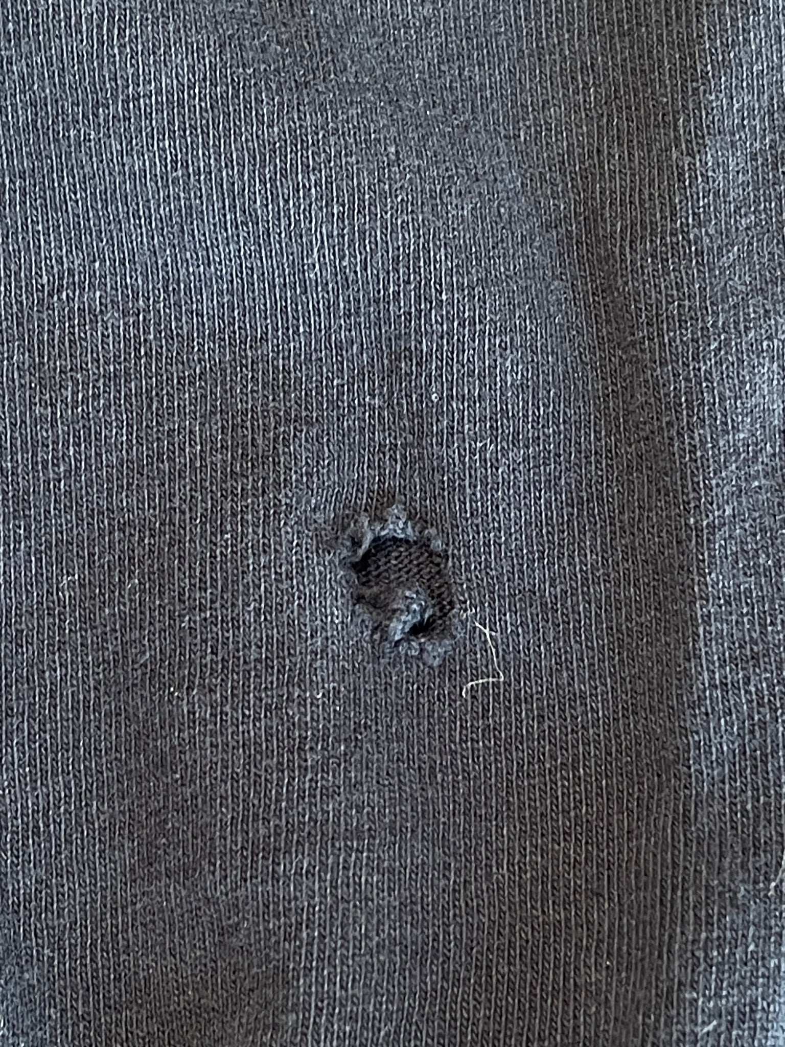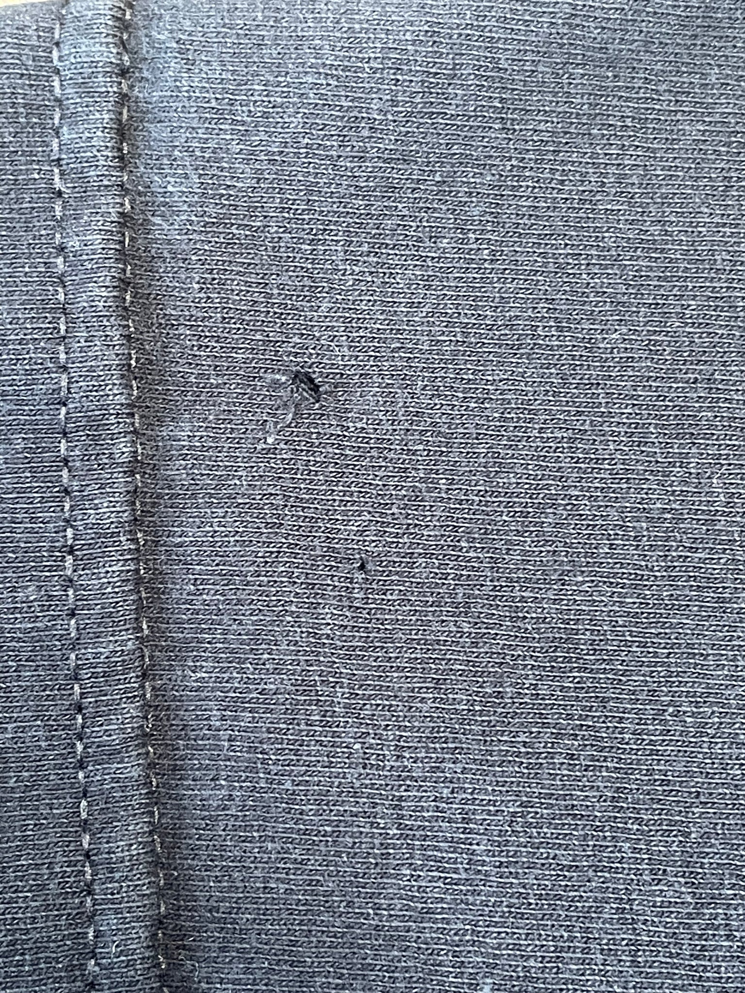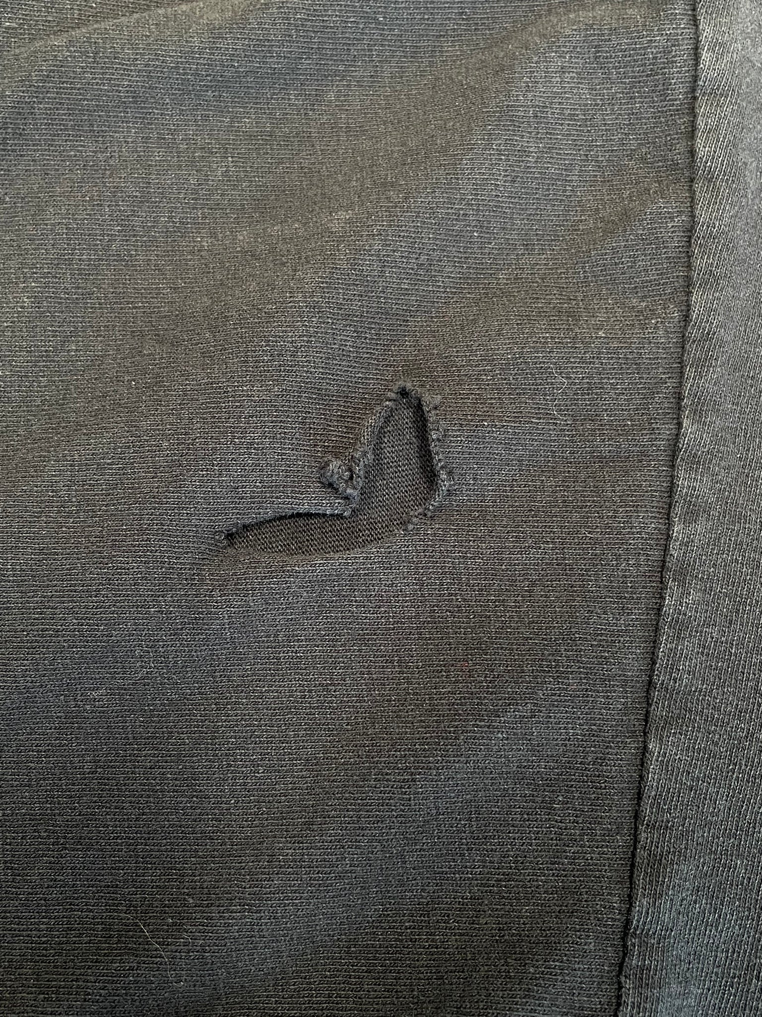 Imperfections: cracking on the print, and 2 holes on the back of the left sleeve