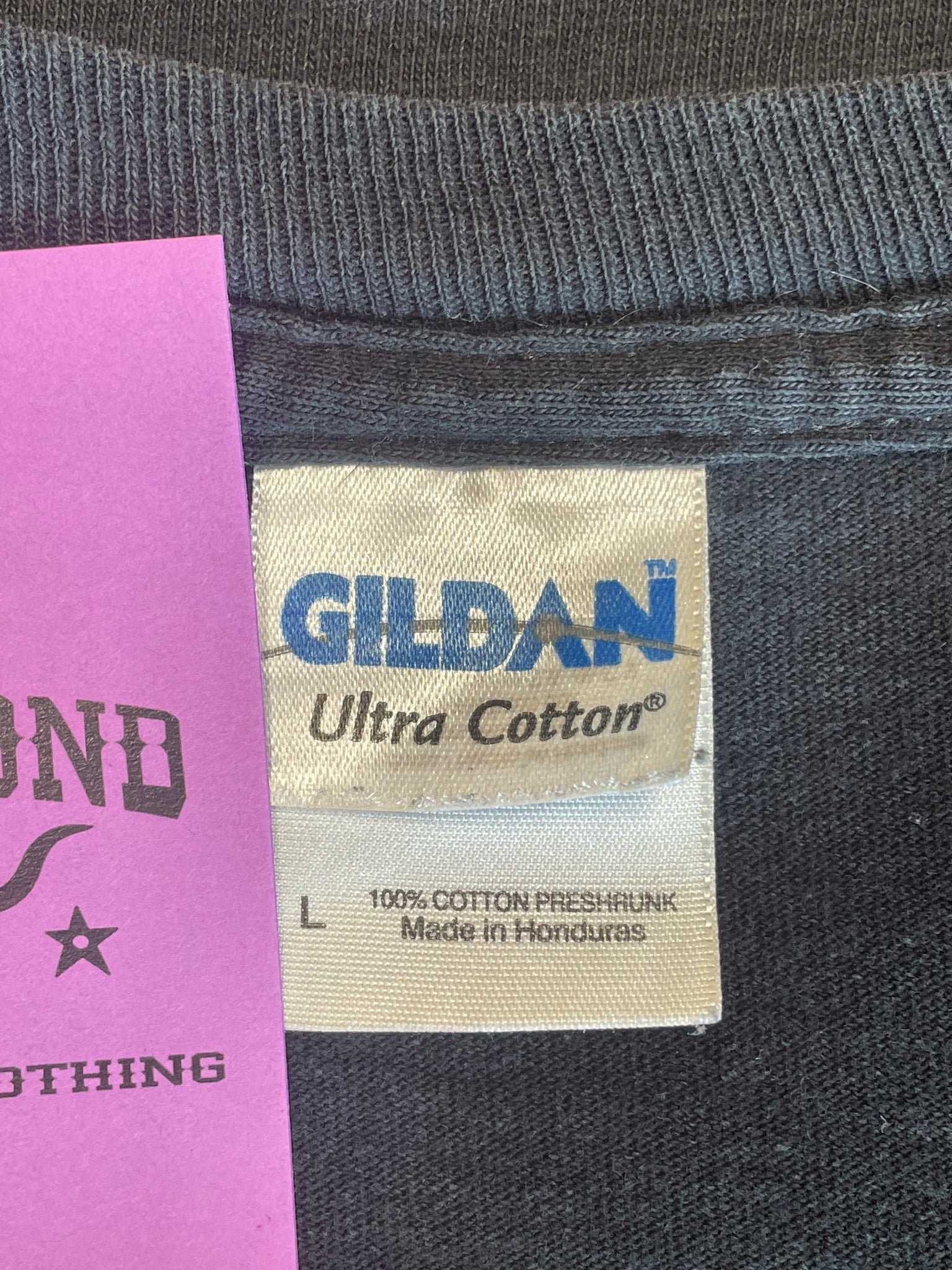 Longsleeve "Durango Wrestling" tee, with a large gothic "D" printed on the front. Some cracking on the print, and the back of the left sleeve has 2 holes, pictured. On a Gildan Ultra Cotton tag, size Large.