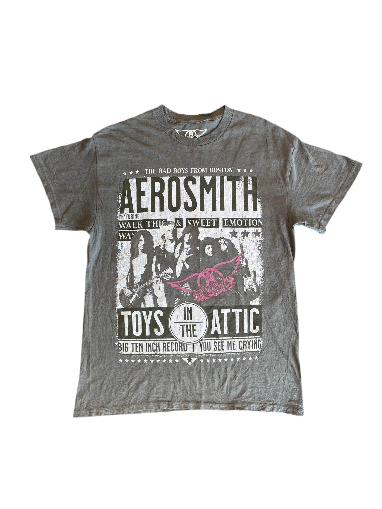 Modern Aerosmith band T-shirt with a large vintage-inspired band poster print on the front. Good condition, size Small, made in the Dominican Republic.