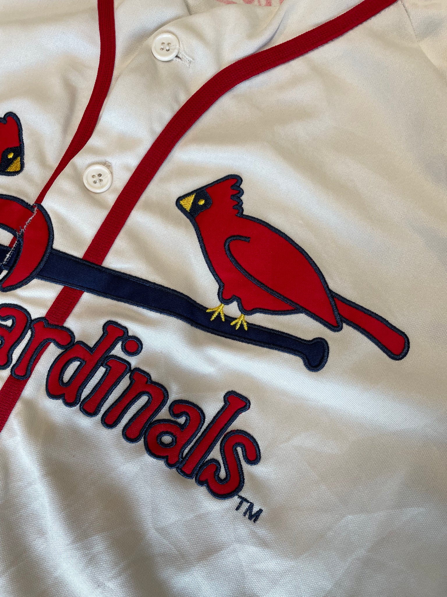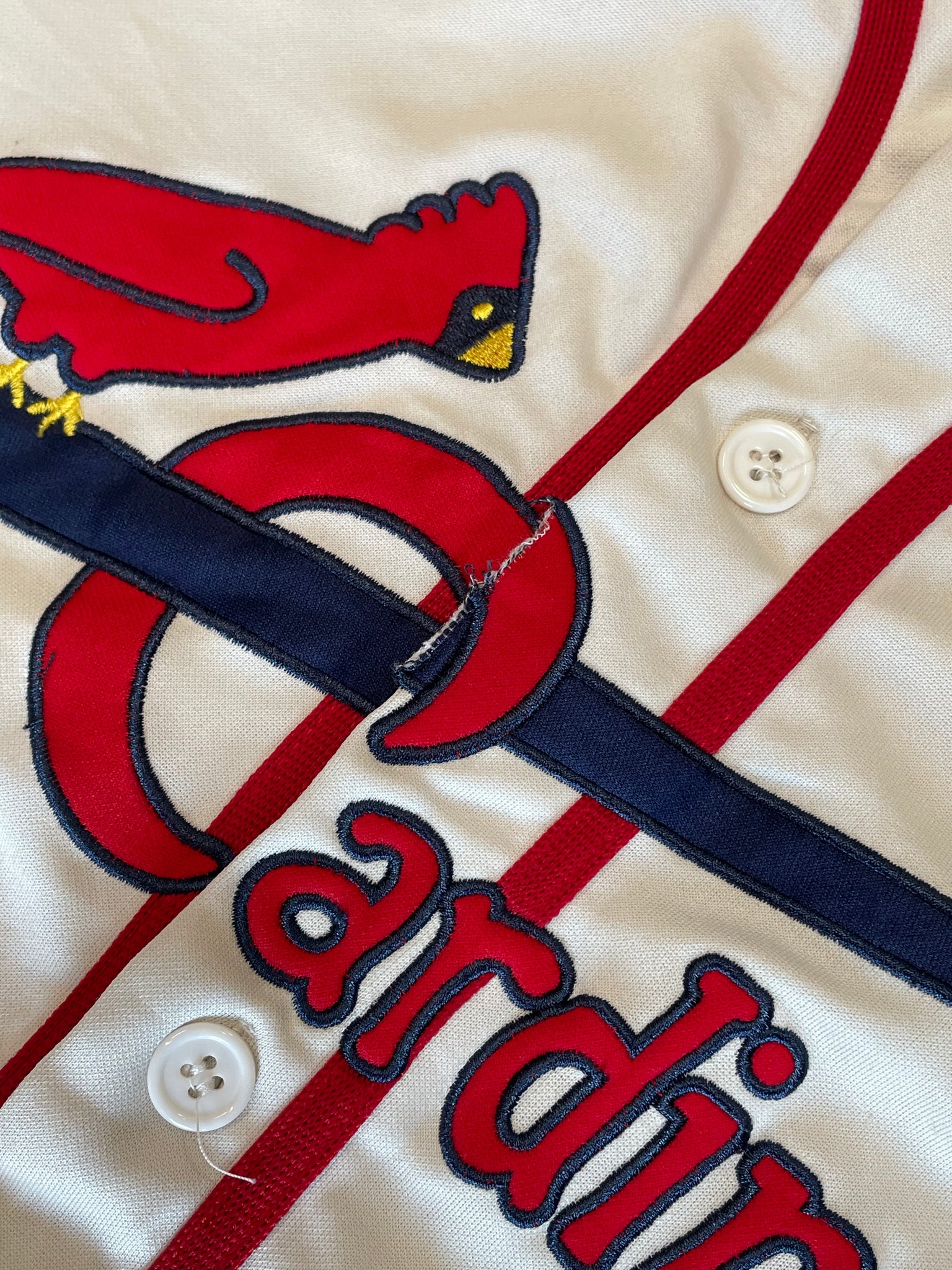 St. Louis Cardinals baseball team jersey, with embroidery patches of the team and mascot on the front across the chest, and one on the sleeve. Size XL, made in China. Lots of small holes and pulls to the fabric towards the bottom hem on the front, pictured. Buttons have some loose thread, otherwise good condition.