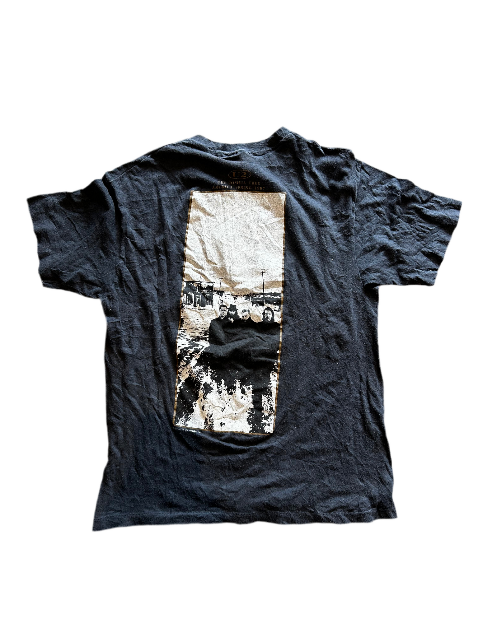 U2 band shirt with the Joshua tree on the front and a photo of the band on the back. Stretched collar.