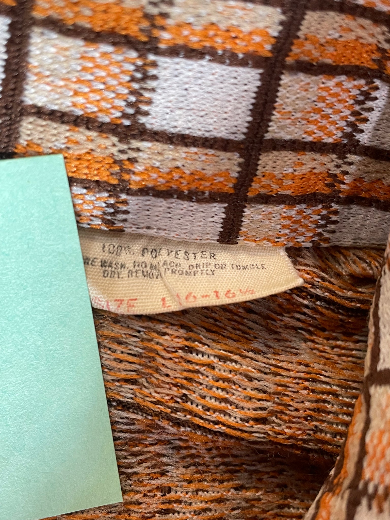 Vintage 1970s dagger-collar button-down, with a checked orange and brown weave pattern. Originally fit larger, but was altered with darts down the inside to fit slightly tighter in the torso and upper arms. No visible flaws, good condition. Tag says size Large, Made in the USA.