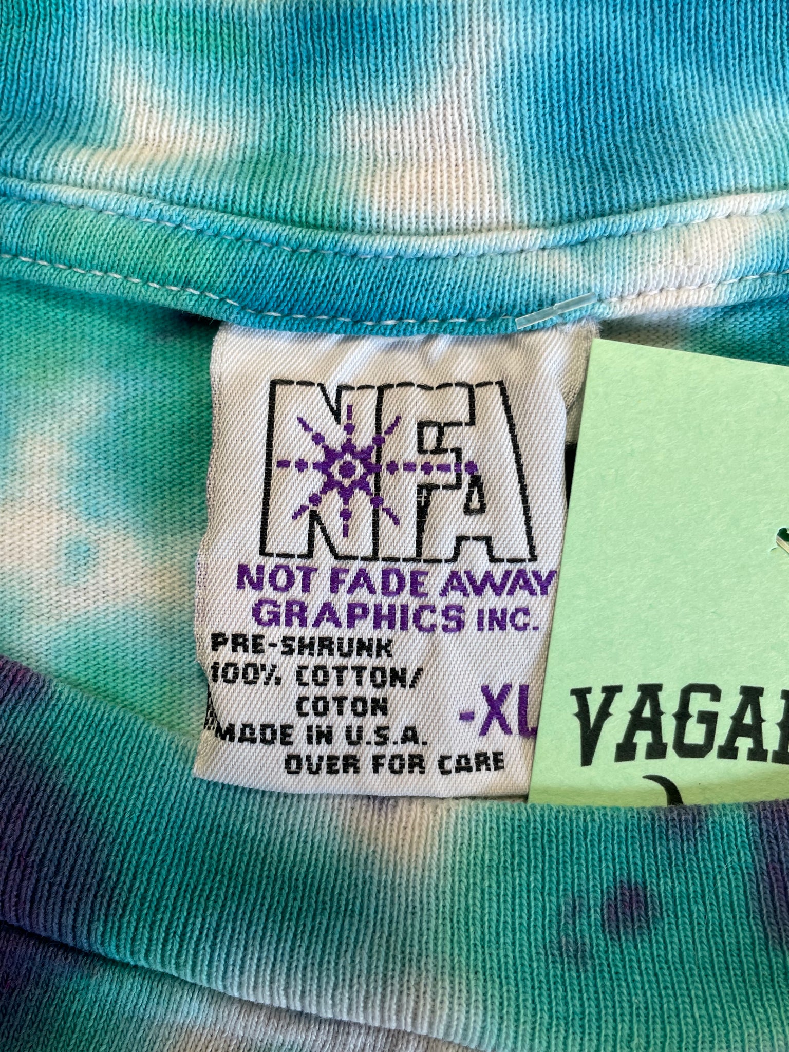 Vintage Woodstock T-shirt from the August 1994 festival. Blue, green, and purple tie-dye, with white Woodstock prints on the front and back. Single stitched, size XL, Made in the USA. A couple of holes on the front, back, and sleeves, pictured.