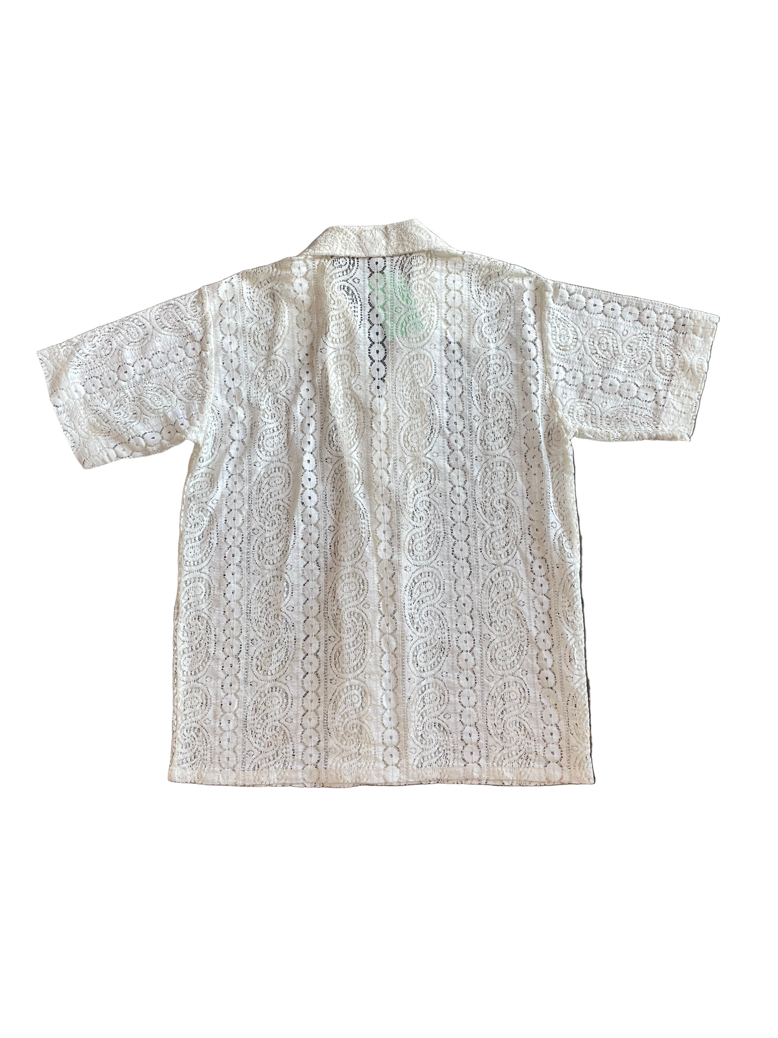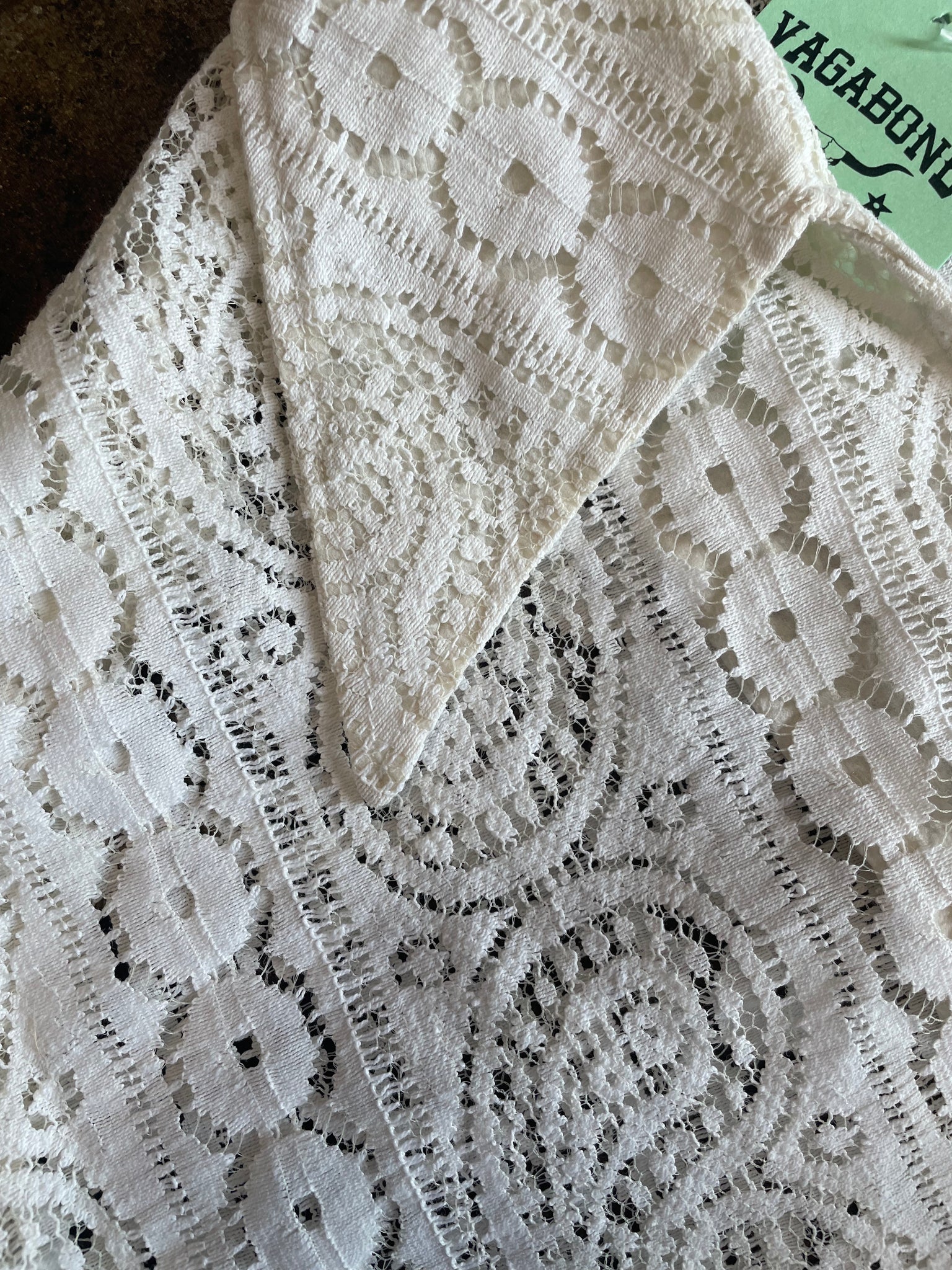 Vintage short sleeved paisley lace button up with a dagger collar and fabric buttons. Tag is too faded to read, but fits like a Large. Good vintage condition, no major flaws found.