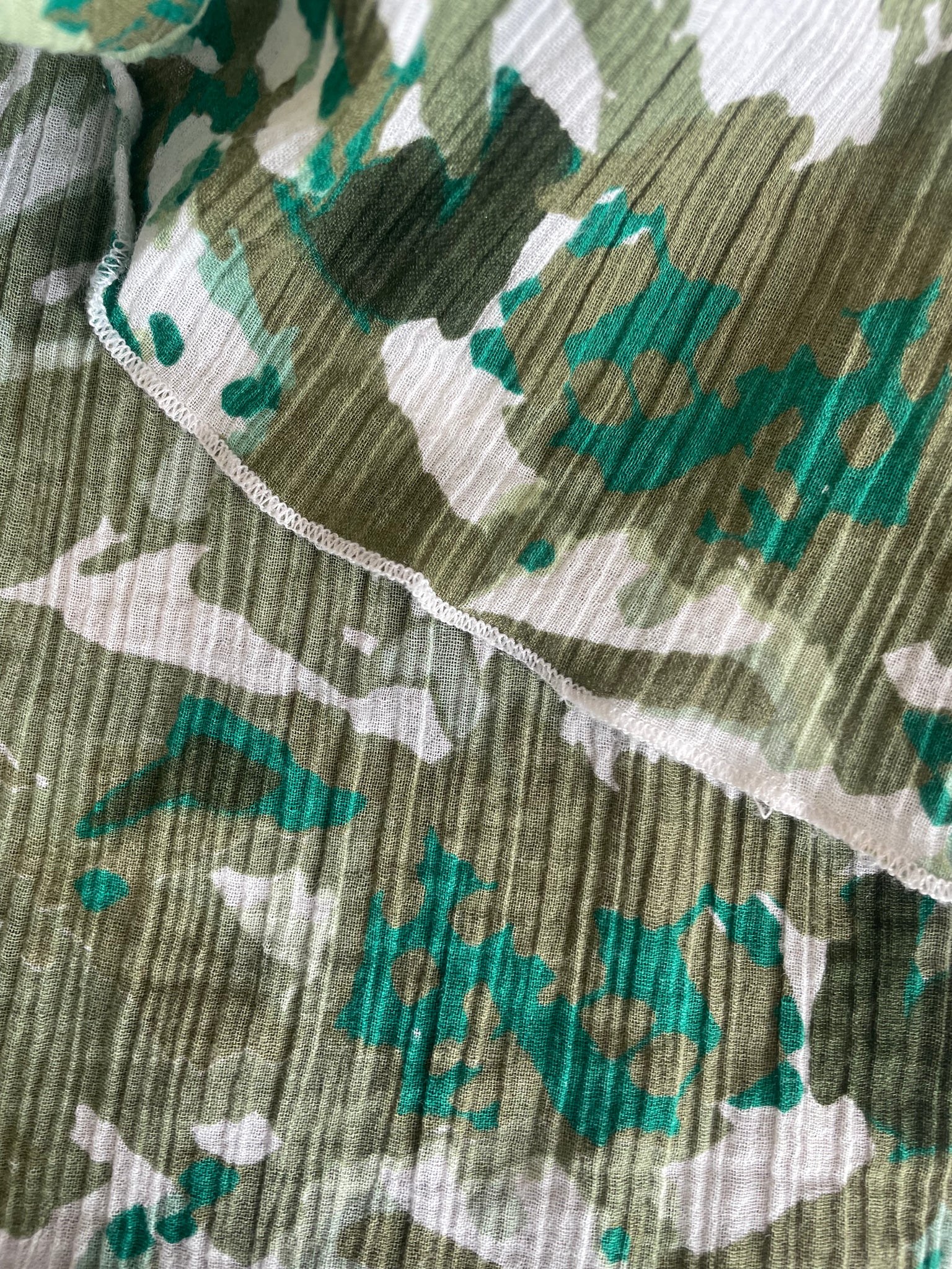 Calvin Klein Jeans brand women's top with a natural and earthy pattern made up of different shades of green, and a textured wide-necked collar. Underarms are slightly faded/stained, and some of the textured stitching from the collar is coming loose. Fits very flowy.