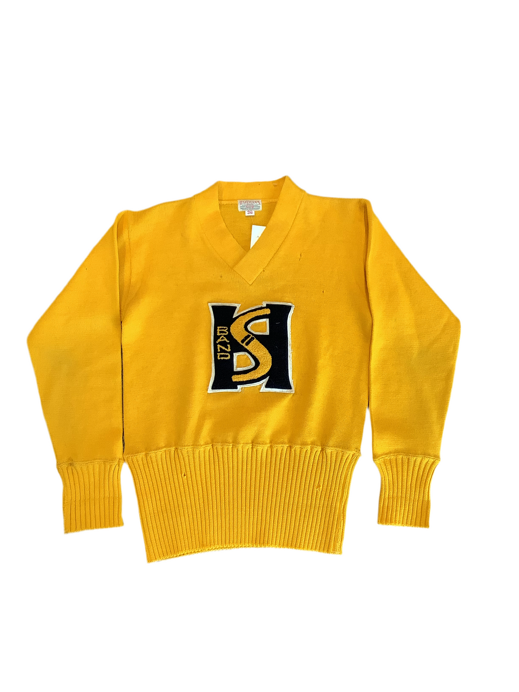 60s Letterman style patch band sweater. Size vintage 36, but fits more like a modern Large. Small pinholes around patch.
